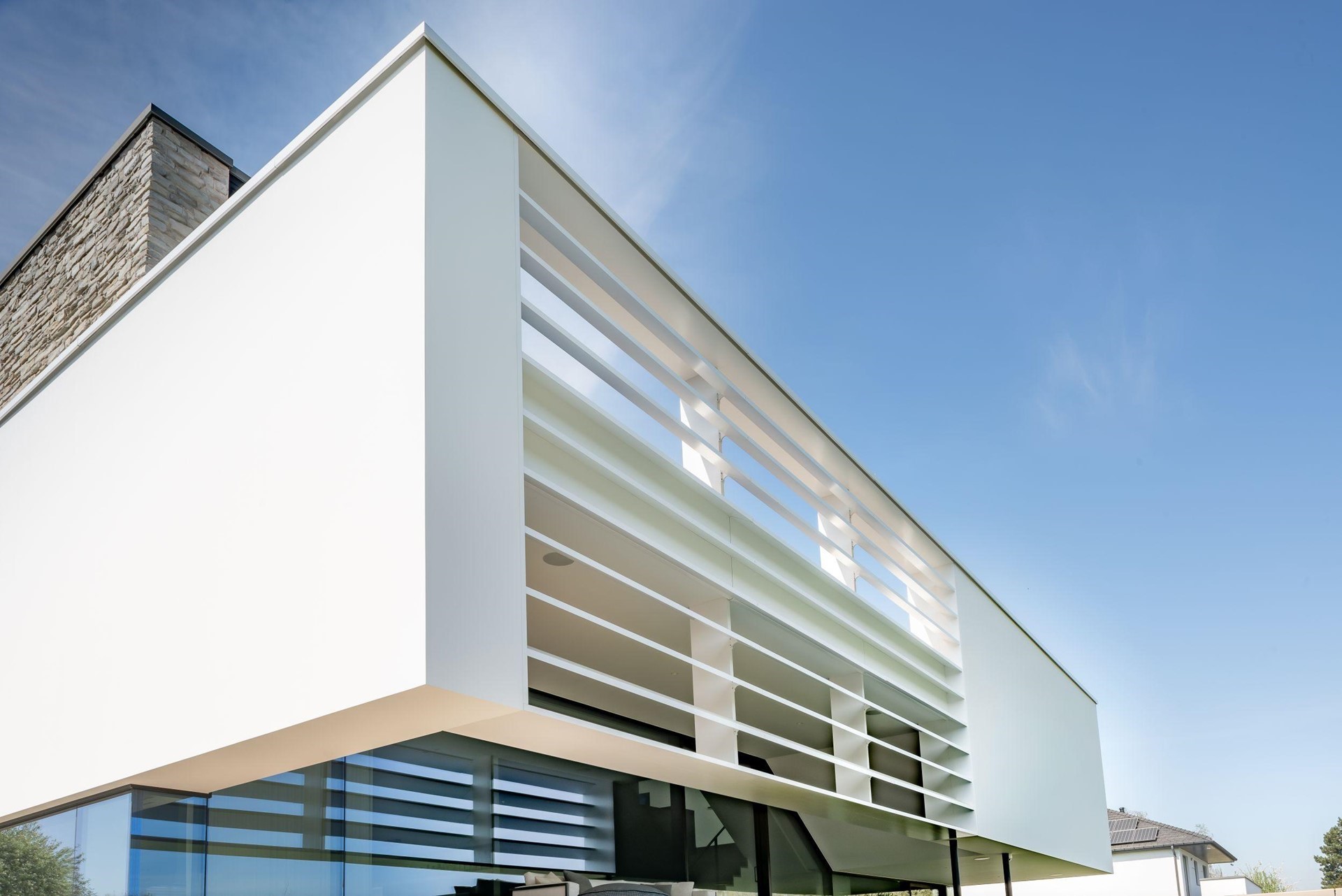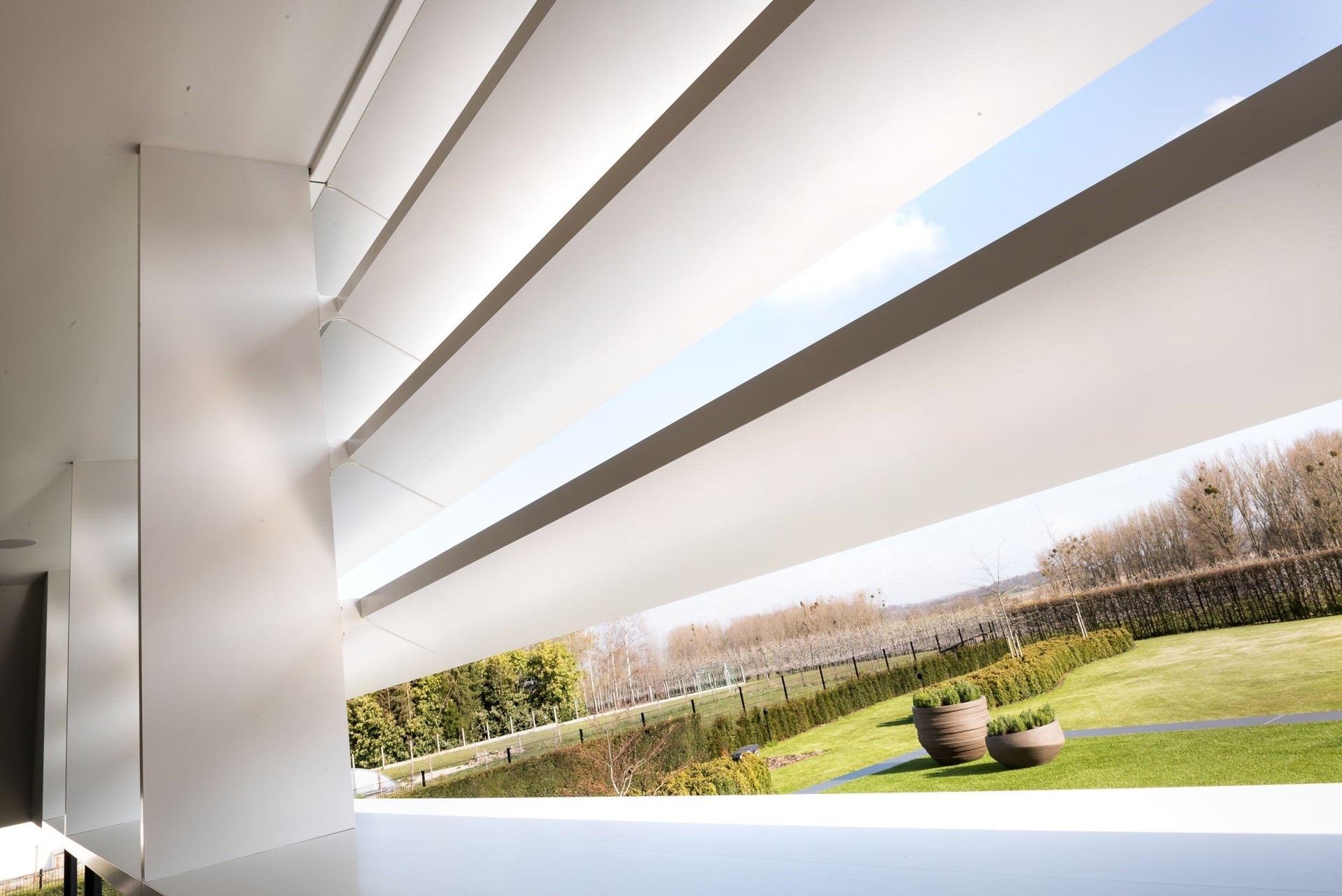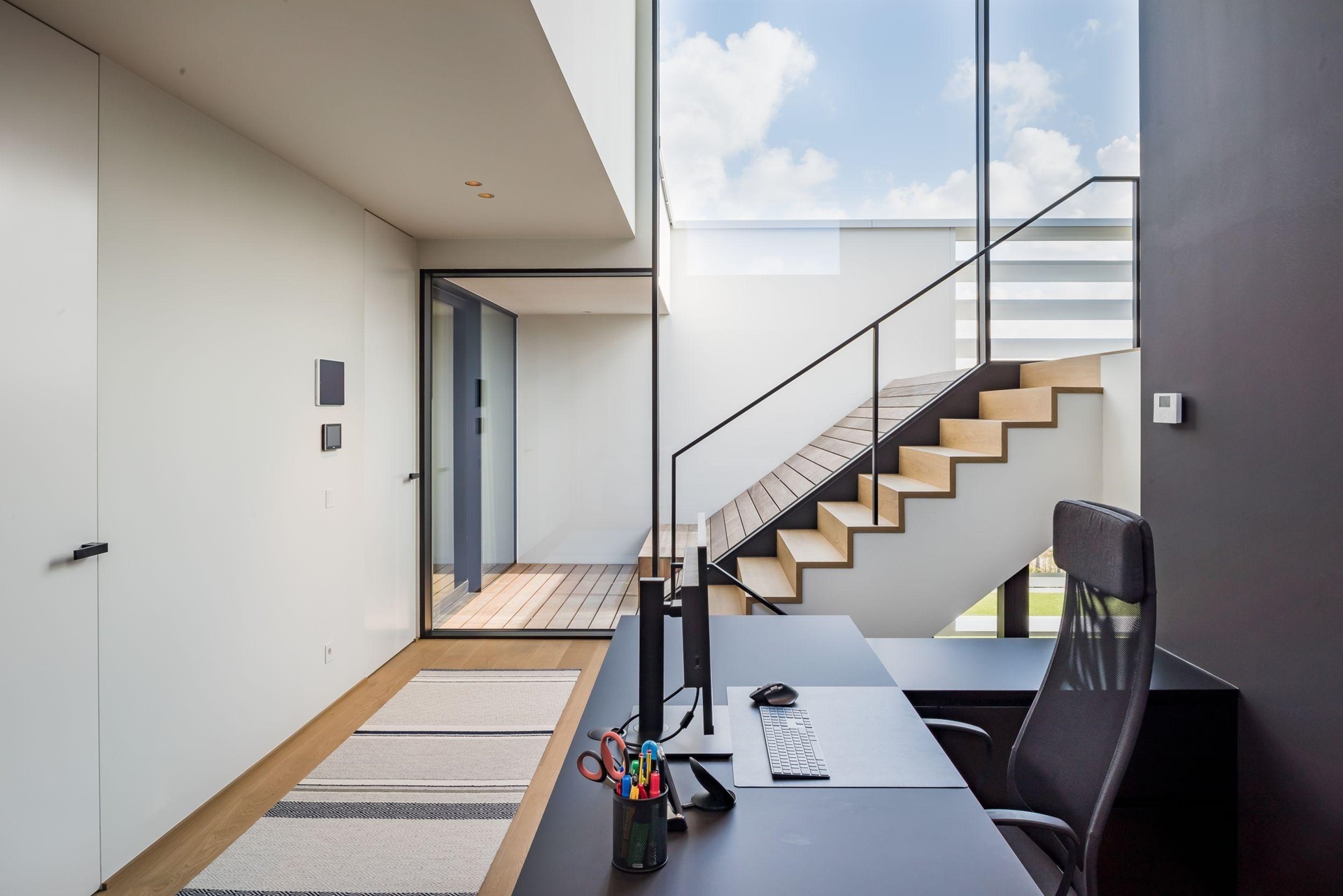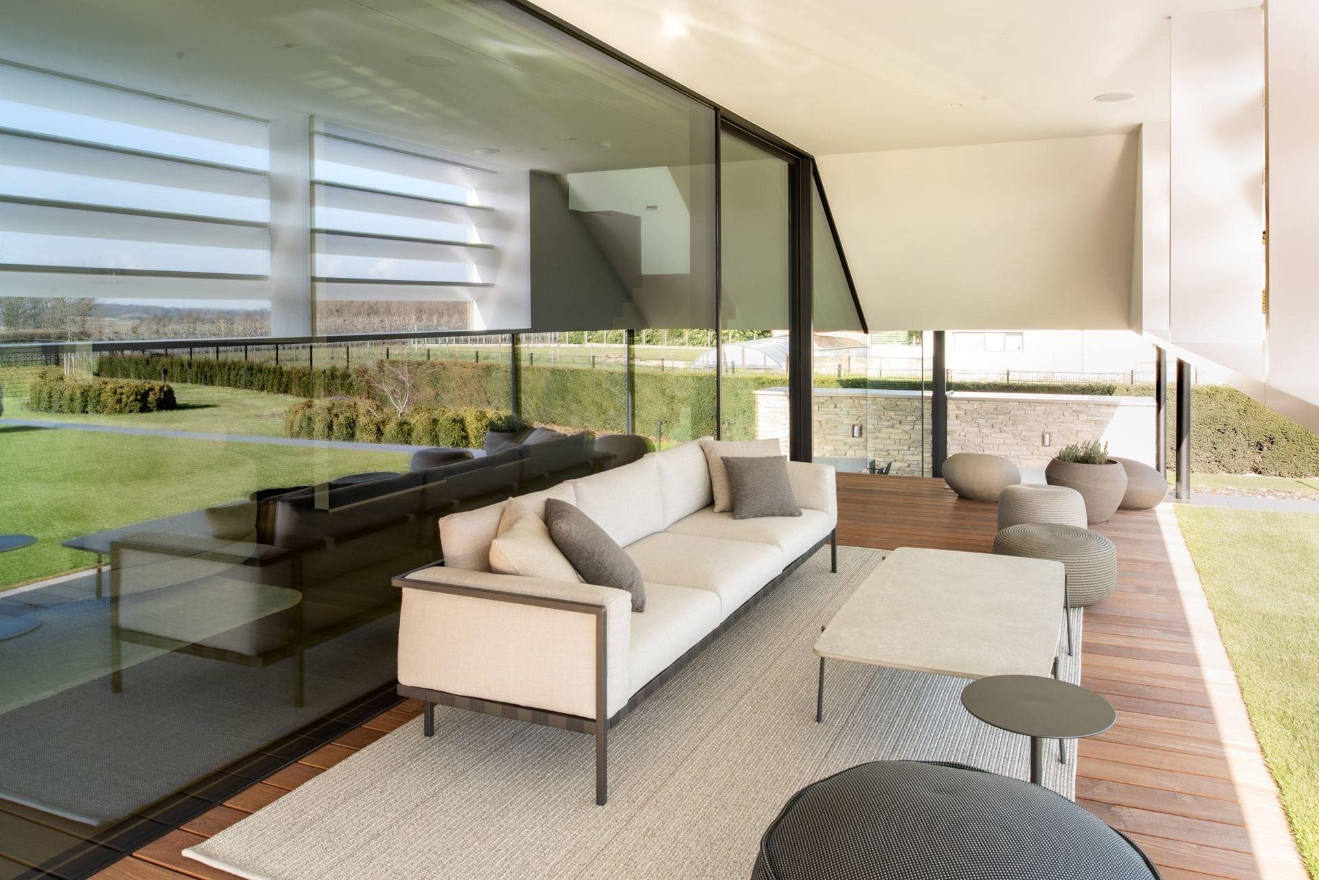 Corswarem heeft bijgedragen aan de realisatie van dit project met hun expertise in geavanceerde raamconstructies, waaronder de toepassing van het Schüco Panorama Design vliesgevelsysteem (FWS 35 PD). Dit systeem integreert naadloos met andere geavanceerde oplossingen zoals het drempelloze schuifraamsysteem, en versterkt de algehele esthetiek en functionaliteit van de woning.