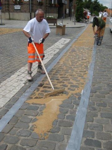 In eerste instantie werden de zijkanten van de rijweg gereinigd en gedeeltelijk uitgevlakt. Dit beperkt opvullen van de kasseivoegen gebeurde met behulp van een snelhardende mortel. Vervolgens werd een oppervlaktecoating met Preco Cryl Kaltplastik 2K grijs aangebracht en ingestrooid met een natuurlijk grijs mineraal met een korrelgrootte van 1 tot 2 millimeter. Door gebruik te maken van deze grote korrels verkrijgt het oppervlak een grote stroefheid. Dit alles maakt dat fietsers zich veel stabieler kunnen verplaatsen en minder hinder ondervinden van de niveauverschillen tussen de kasseien.