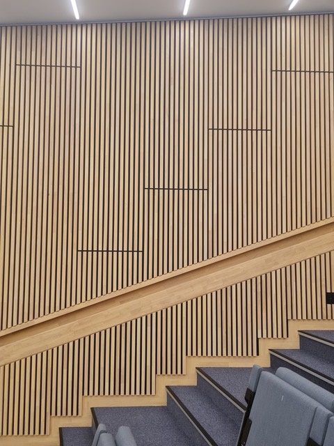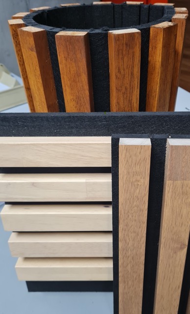 "Dit is een esthetisch geslaagd product met een massief houten lat, verkrijgbaar in verschillende houtsoorten en in diverse oppervlakte afwerkingen (transparant vernis tot kleurolie). Doordat de latten vooraf werden gemonteerd is de kwaliteit hoger. De latten bieden een zekerheid van absortie, ze werden nauwkeurig getest in een Europees erkend akoestiek labo met verschillende opbouw. De platen zijn eenvoudig te monteren, eenvoudig en kwalitatief te verzagen op de werf en is snel te monteren via verlijming of zwarte schroeven of haaklatten."