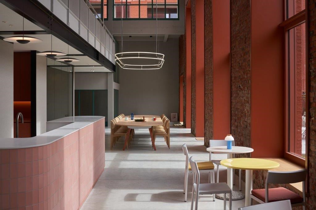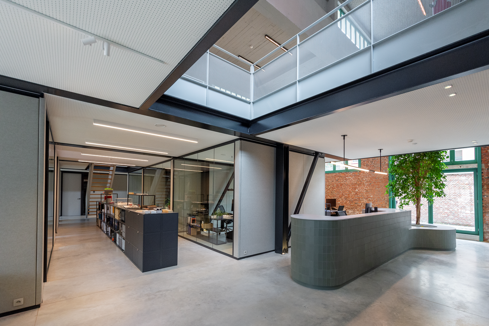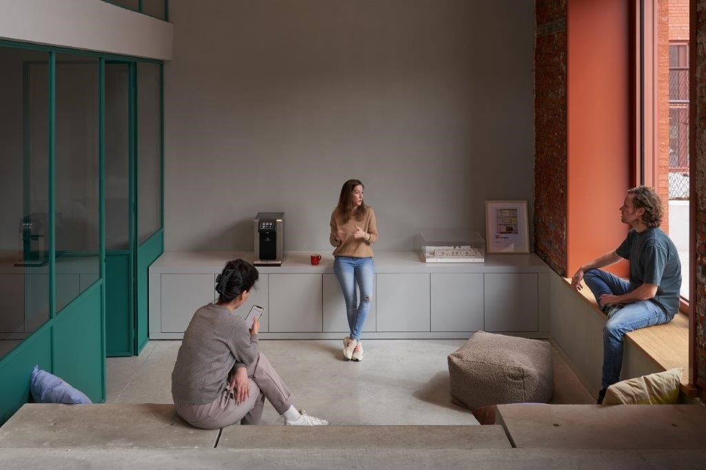 De interieurinrichting is maximaal geënt op het omringende casco, met grijs, groen en terracotta als dominante tinten. “Ze keren onder meer terug in de nieuwe polybetonvloer en de gestoffeerde akoestische wanden (grijs), de betegeling van de inkombalie (groen) en de toog in de eetruimte (terracotta) en de kleur van de keuken (terracotta). Het was toch even zoeken om daar een goede balans in te vinden, in combinatie met het zwarte staal en de nodige houtaccenten”, geeft Jens Jansen aan. “Daarnaast hebben we maximaal ingezet op comfort en gezelligheid om een aangename werksfeer te creëren, met akoestiek als belangrijk speerpunt. Naast de gestoffeerde dwarswanden dragen ook de geperforeerde gipsplafonds boven het gelijkvloers van de mezzanine, de tapijtbekleding op het verdiepingsniveau en de grijze spuitpleister bovenaan de hal hun steentje bij. In een ruwe industriële setting als deze is het een hele opgave om een aangenaam akoestisch klimaat te creëren, maar dat is uitstekend gelukt. Voor de verlichting hebben we dan weer samengewerkt met Modular Lighting Instruments. De voornaamste eyecatcher is de grote neonlamp boven de eettafel, die geflankeerd wordt door de metershoge ramen in de vernieuwde gevel. Het is mooi om te zien hoe het licht hier doorheen de dag evolueert.”