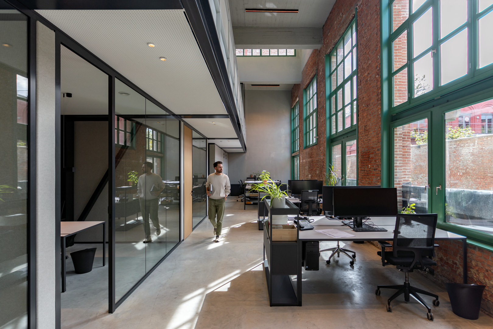 Om de beschikbare ruimte optimaal te kunnen benutten zonder het authentieke karakter van de oude fabriekshal teniet te doen, besloten de architecten een langgerekte stalen mezzaninestructuur te integreren. Daarbij hielden ze rekening met de vraag van het Agentschap Onroerend Erfgoed om aan de langsgevels twee grote vides te creëren en zo de grandeur van het geheel te vrijwaren. “Onder het gebouw bevindt zich een nieuwe ondergrondse parking, dus de punten waar we de kolommen konden plaatsen lagen vast. Daar zijn we creatief mee omgesprongen om de nodige symmetrie te creëren tussen beide vides, onder meer via de toevoeging van schuine kolommen. Buiten een vaste technische zone met de serverruimte, het HVAC-lokaal en het sanitair aan het uiteinde van de hal is de ruimtelijke indeling flexibel opgevat. Op het gelijkvloers hebben we de zwarte mezzaninestructuur hoofdzakelijk ingevuld met individuele kantoren, via een combinatie van glazen wanden (langsrichting) en gestoffeerde akoestische wanden van Beddeleem (dwarsrichting) om zo veel mogelijk transparantie te behouden en laterale doorzichten te creëren. Het verdiepingsniveau biedt plaats aan een grote open ruimte met verschillende kantooreilanden, waar je een mooi uitzicht hebt op de omgeving en de rest van het kantoor”, legt Geert Bekaert uit.
