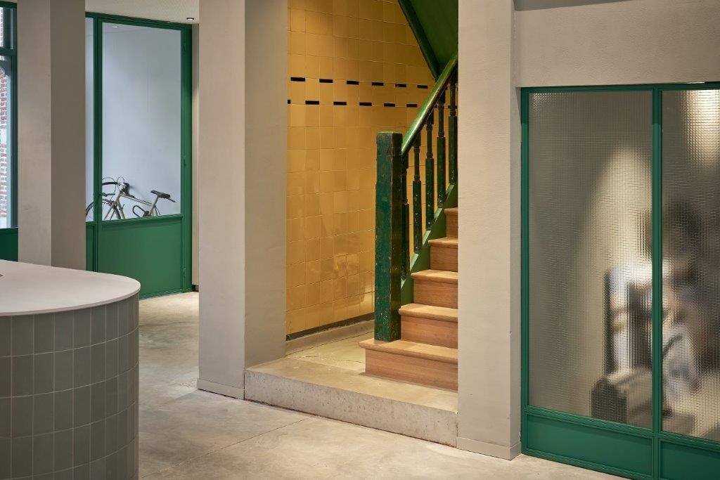 Ook qua duurzaamheid gooit het nieuwe kantoor van assar architects hoge ogen. “We hebben geen gasaansluiting meer. Verwarmen en koelen gebeurt met behulp van warmtepompen, vloerverwarming en een nieuw ventilatiesysteem. In een ideale wereld hadden we ook koelplafonds geïnstalleerd, maar dan zouden we de mooie oude betonplafonds aan het zicht onttrokken hebben”, zegt Geert Bekaert. Voorts zijn er nog heel wat andere historische elementen bewaard en geïntegreerd in de nieuwe kantoorsetting. “De zijdelingse muren waren in het verleden betegeld en bepleisterd, maar wegens de slechte staat hebben we ervoor gekozen om de originele bakstenen in ere te herstellen. De wandbetegeling van de oude traphal was daarentegen wel nog in goede staat en werd bijgevolg behouden. Ook de houten trap zelf werd bewaard – inclusief de uitgefreesde silhouetten van boterbloemen in de trapleuningen, die verwijzen naar het feit dat het gebouw in 1905 was opgetrokken als boterfabriek – evenals het directiekantoor dat via een groot raam uitkeek op de fabriekshal. Daar heeft onze huidige zaakvoerder Dieter Wuyts intussen zijn intrek genomen”, knipoogt Jens Jansen.
