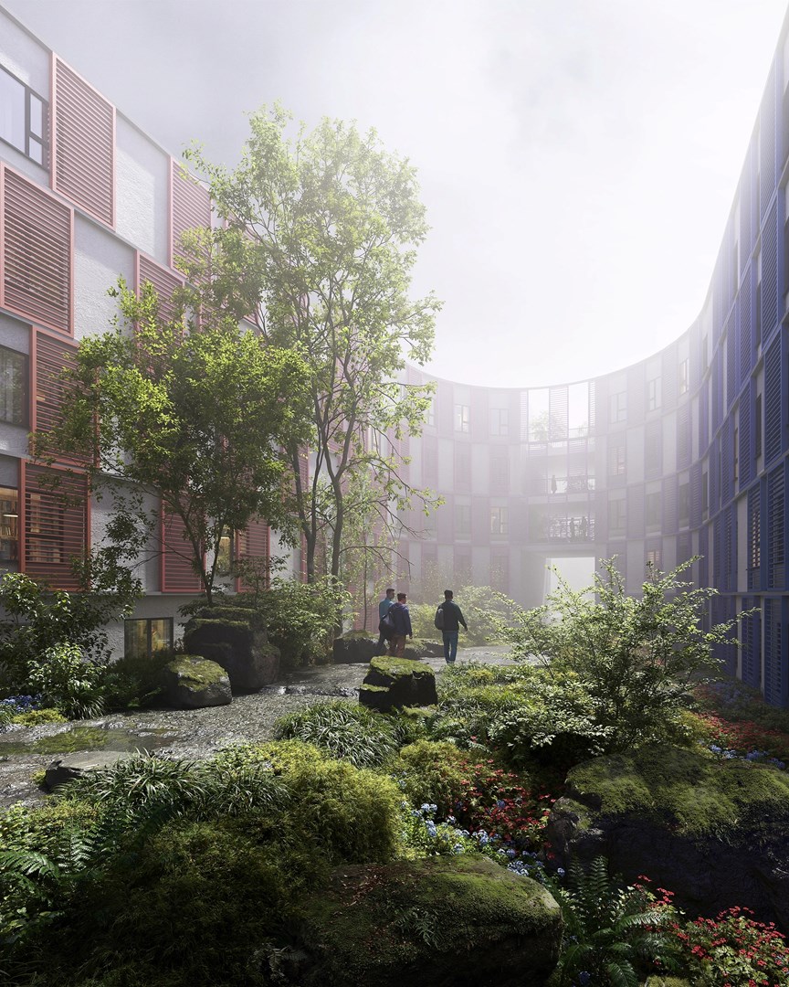 Het ontwerp van het binnenhof houdt rekening met praktische aspecten zoals brandveiligheid en logistiek. De ruimte is groot genoeg om brandweerwagens toegang te bieden en kan ook worden gebruikt voor leveringen en afvalinzameling. Strategisch geplaatste liften en trappen verbinden de verschillende delen van het complex, terwijl gemeenschappelijke terrassen extra mogelijkheden voor sociale interactie bieden. Deze praktische en doordachte aanpak maakt het project niet alleen aantrekkelijk, maar ook duurzaam en toekomstbestendig.