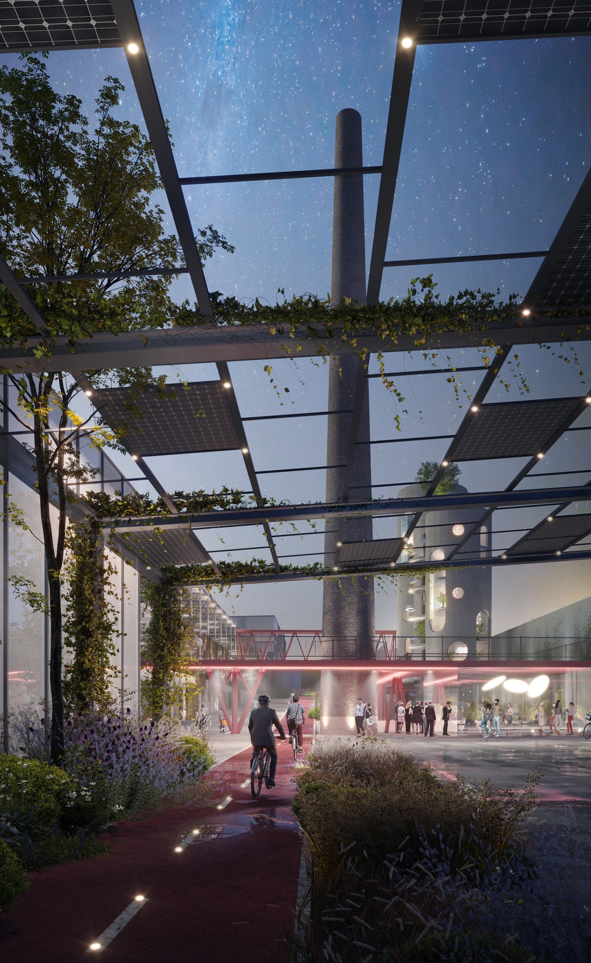 De pleinzone vindt connectie met de toenmalige productiehal waar een mix van functies kunnen worden ondergebracht: de bestaande structuren bieden de mogelijkheid om parkeergelegenheid, sportinfrastructuur, opslag en ateliers te combineren binnen één multifunctionele hub.