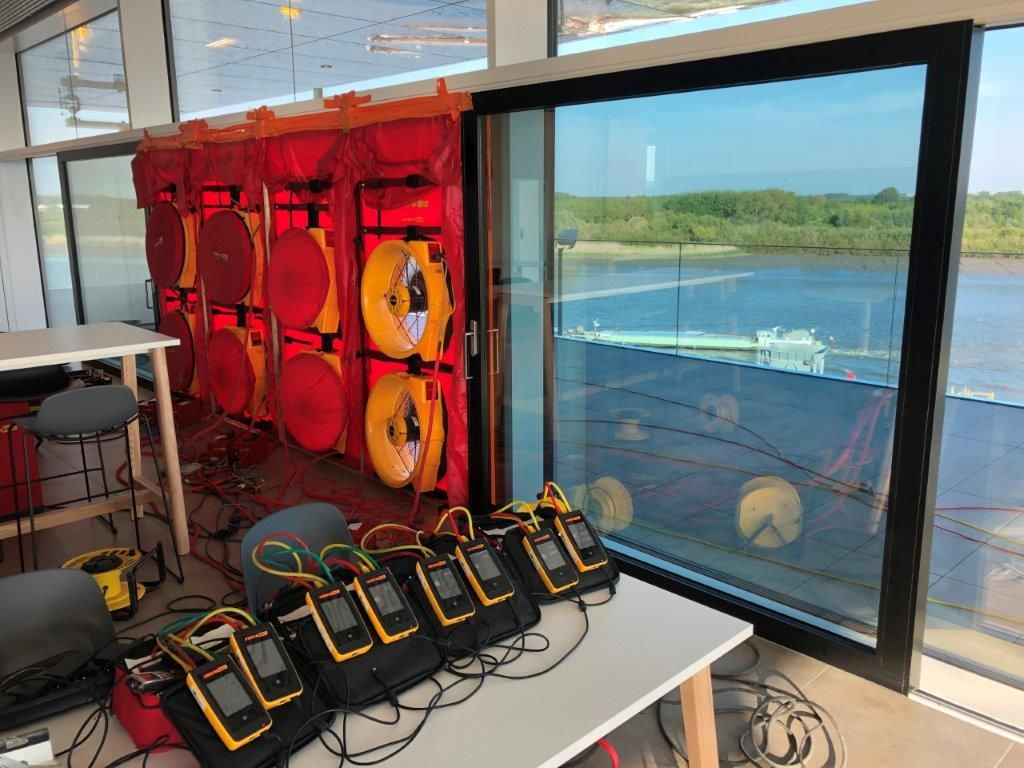 De blowerdoortest in ‘Kantoorvilla Cordeel’ vond half mei plaats. Hij werd uitgevoerd door Metifix, dat zich tevens toespitst op EPB-verslaggeving, luchtdichtheidstesten en tal van andere meet- en keuringsprocessen. “Het resultaat was zeer gunstig. We kwamen uit op een waarde van 3,6 m³/h.m² (v50). Ter vergelijking: de EPB-verslaggever had een resultaat onder de 6 vooropgesteld, en de EPB-defaultwaarde ligt op 12 m³/h.m²”, legt Metifix-zaakvoerder Patrick Brants uit. “Bovendien hebben we vastgesteld dat er quasi geen sprake is van negatieve luchtstromen vanuit de kantoorruimtes. Haast alle luchtlekken zijn te wijten aan de verbindingen met de bestaande pompkelder (waarin de technieken zijn ondergebracht) en de liften. Kortom: de kantoren op zich zitten zelfs onder een waarde van 3 m³/h.m², waardoor we voor het geconditioneerde volume kunnen gewagen van een ‘zeer luchtdichte’ buitenschil.”