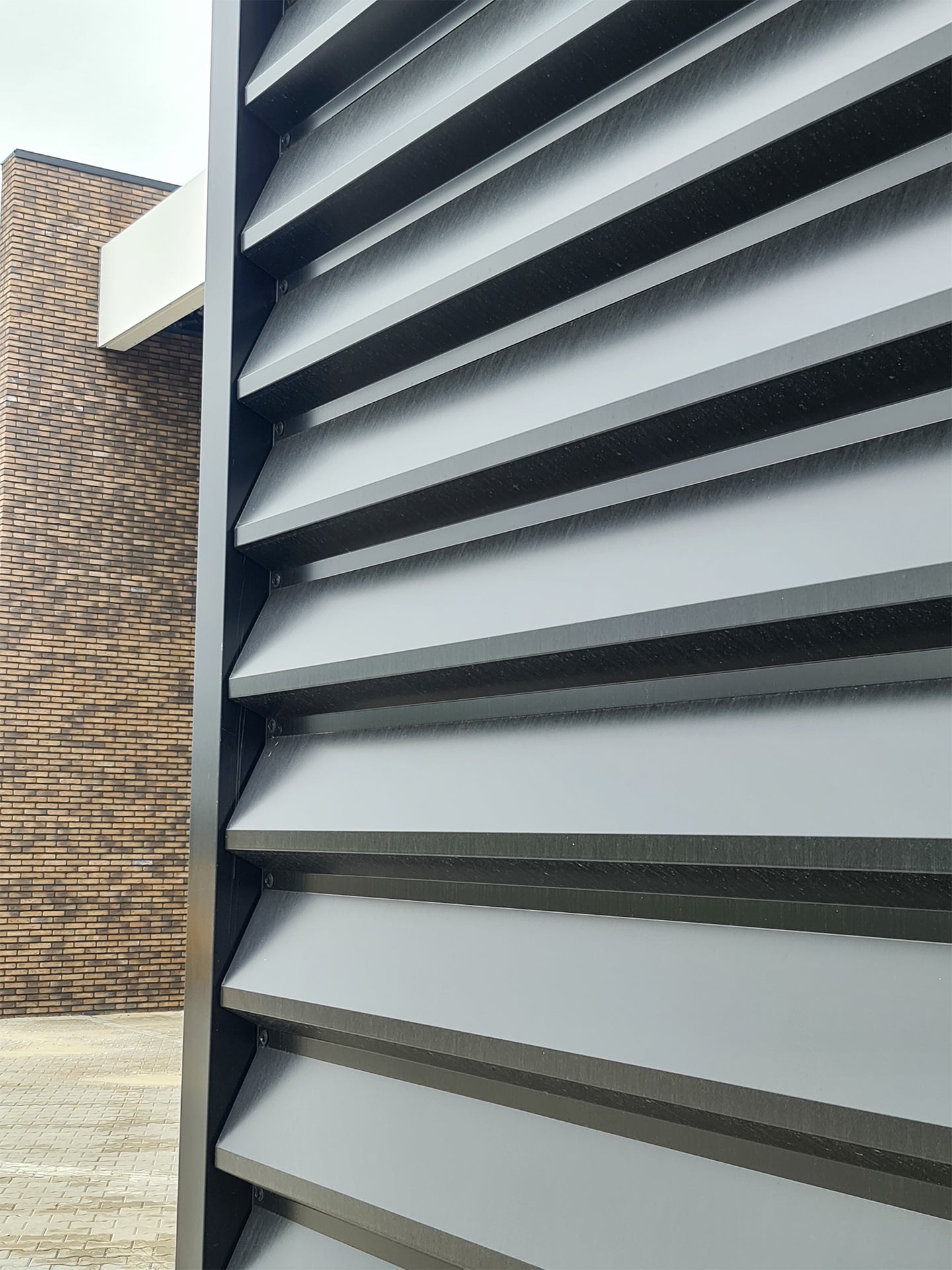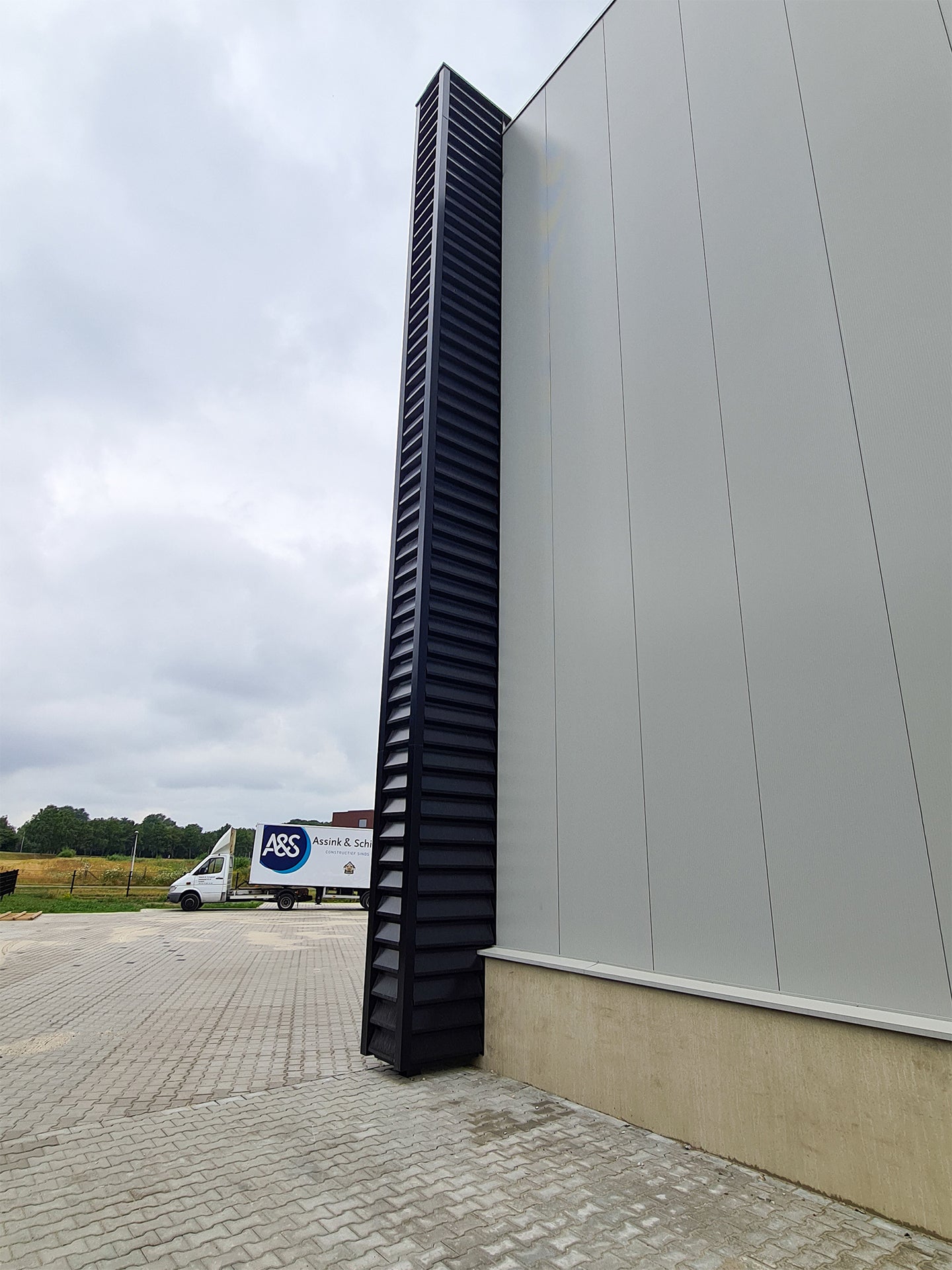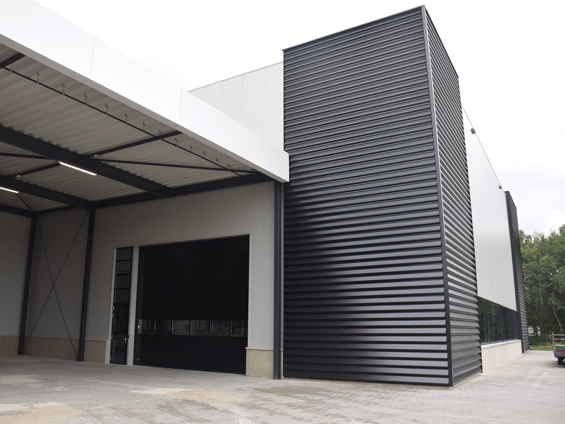 Naast de verticaal georiënteerde, blind bevestigde sandwichpanelen in PIR, zijn er JI Breva 66 profielen toegepast in de gevelvlakken van het gebouw. Deze uniek gezette profielen in zwart zijn horizontaal georiënteerd en worden over de gevelpanelen heen gezet. De opdrachtgever heeft samen met de ontwerper gekozen voor het Breva profiel om het gebouw een eigen identiteit te geven. En vooral de combinatie met de sandwichpanelen in een lichte kleur zorgt dat voor een supermooie uitstraling.