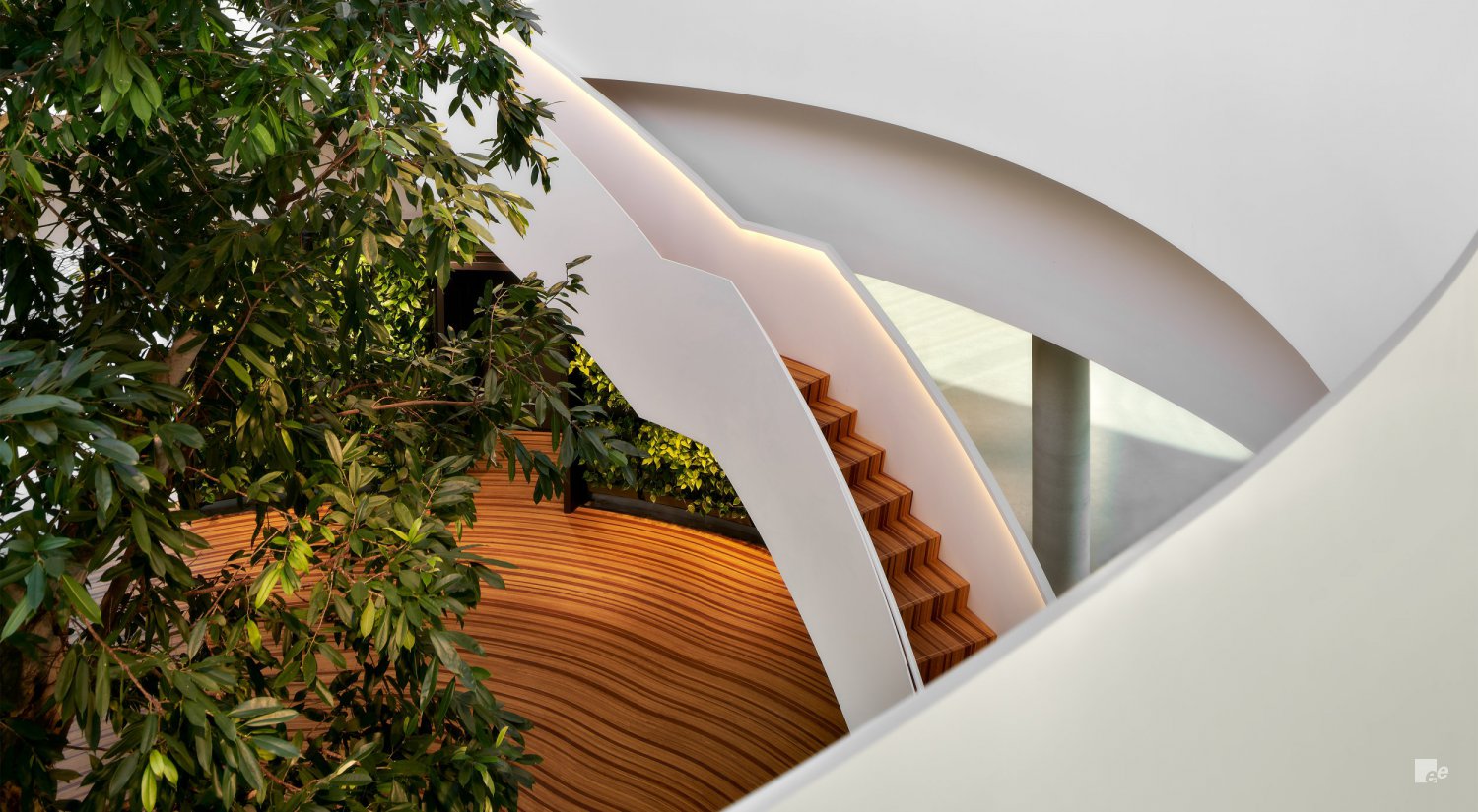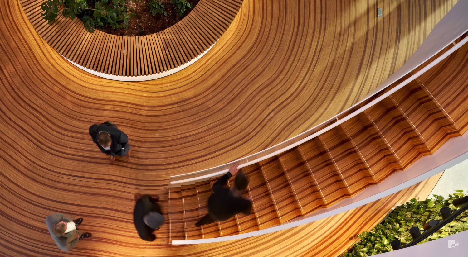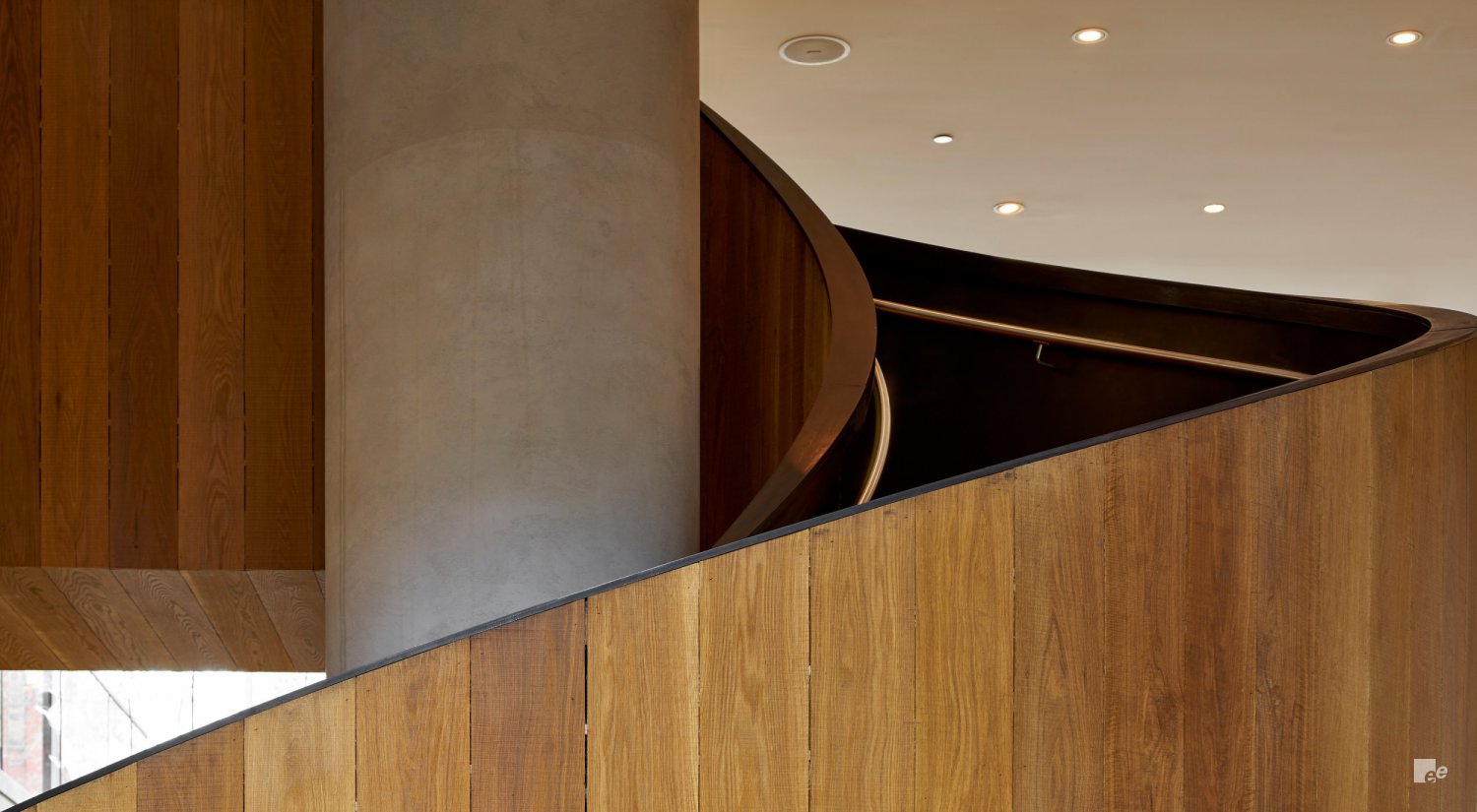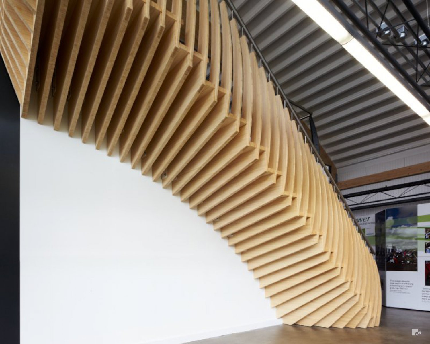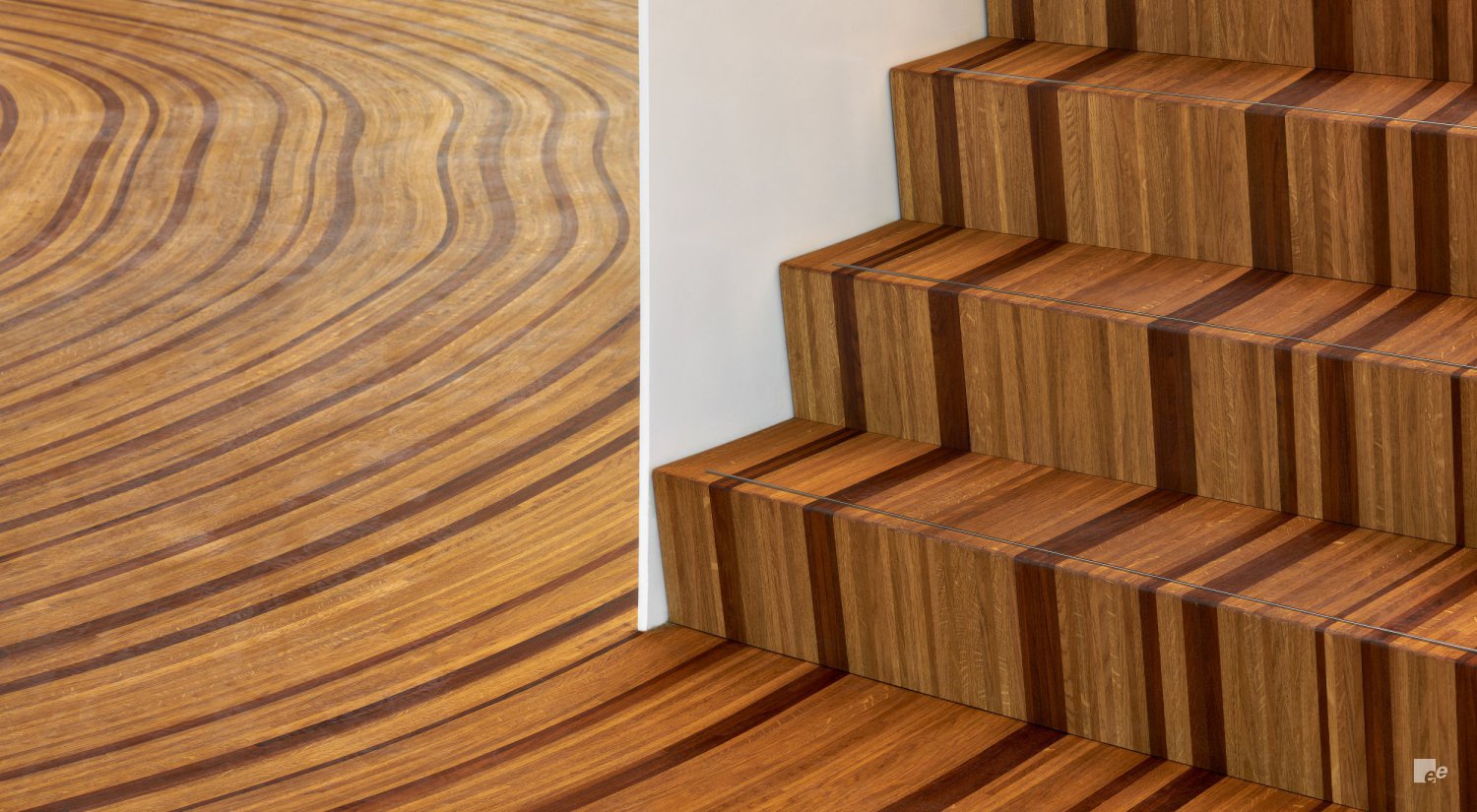 Voor het nieuwe kantoor van Krinkels BV in Breda ontwierp EeStairs bijvoorbeeld twee trappen die de cirkelvorm van het begane grondoppervlak perfect volgen. Het FCS-gecertificeerde hout van de trappen en de vloer werd op zo’n manier gelegd dat ze het effect van groeiringen in een boom nabootst. Samen met houtkunstenaar Jakko Woudenberg zag EeStairs erop toe dat de donkere en lichte ringen van de vloer naadloos overgingen in die van de traptreden. De witte stalen trapconstructies met gladde EeSoffits werden in twee delen geleverd en ter plaatse geïnstalleerd en gespoten.
