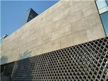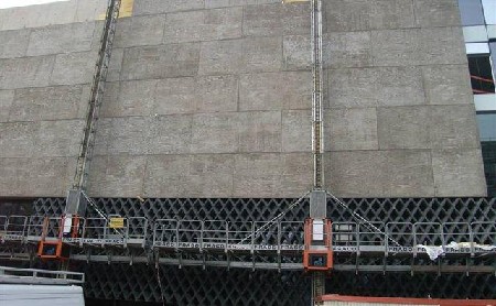 In totaal werden een 100-tal elementen geproduceerd, stuk voor stuk verschillend. De diversiteit werd verkregen door de houten platen telkens anders in de bekisting te positioneren. De enkelschalige panelen werden met ankers aan de structuur opgehangen.