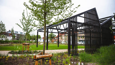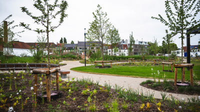 Wat jarenlang een grijze parkeerzone was in het hart van Roeselare, is vandaag een levendig stadspark dat inzet op ontmoeting, verkoeling en ecologie. Op vraag van Stad Roeselare transformeerde ontwerpbureau OMGEVING, in samenwerking met VK architects+engineers, de voormalige Moermanparking tot een klimaatadaptief park van ruim 9000 m². Strategisch ingeplant tussen de Ronde Kom en de Kleine Bassin vormt het park een groene long vlak bij het kernwinkelgebied. Waar auto’s vroeger domineerden, bepalen nu bomen en bloemen het ritme van de plek.