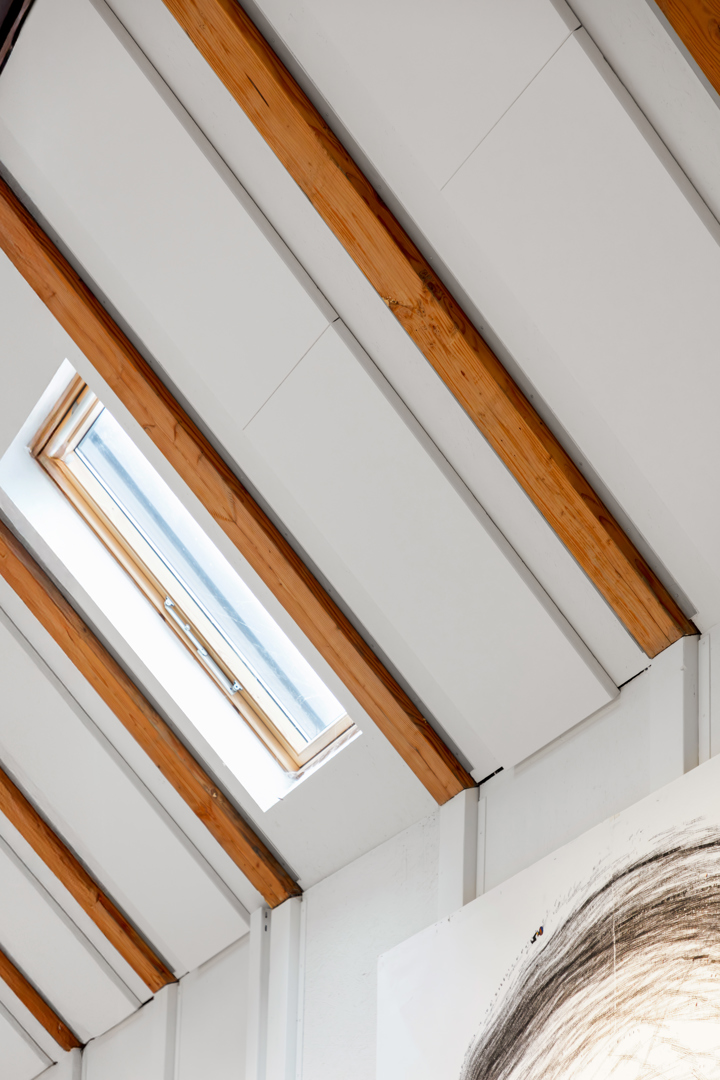 In de gang naar het centrale atrium werden akoestische panelen geïntegreerd tussen de houten spanten. “Wij hebben hier Rockfon Blanka Activity B geadviseerd”, vertelt Frédéric Mélotte, Area Sales Manager van Rockfon. “Door het matte, niet-legrichtinggebonden oppervlak wordt de installatietijd verkort. Bovendien zorgt de dikte van 40 mm voor een optimale geluidsabsorptie. De panelen zijn goed bestand tegen vuil en gewone slijtage, waardoor het product langer meegaat. De toepassing tussen de houten spanten aan één kant van de gang, biedt niet alleen een akoestische verbetering, maar heeft ook een mooie esthetische uitstraling.”