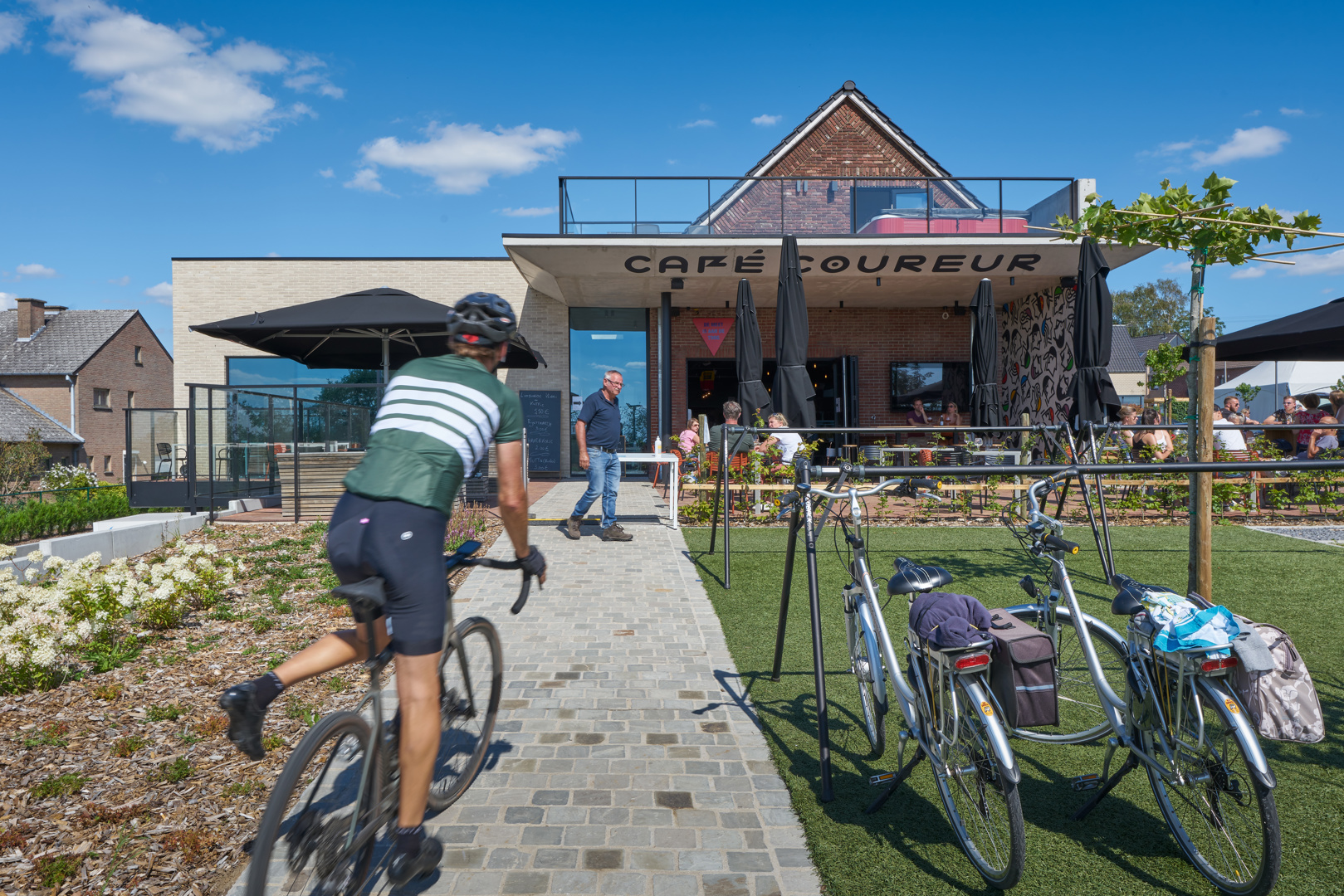 Café Coureur is meer dan een horecazaak: het is een bestemming voor de wielerliefhebber. In Borgloon werd het concept verankerd in een voormalige schoolsite met aangrenzend oud gemeentehuis. Hier vinden bezoekers een zuidgericht terras, een brasserie, doucheruimtes, een eventzaal en uitgebreide fietsvoorzieningen zoals laadpunten, een afspuitzone, een bewaakte fietsenkelder en een reparatiekelder.
