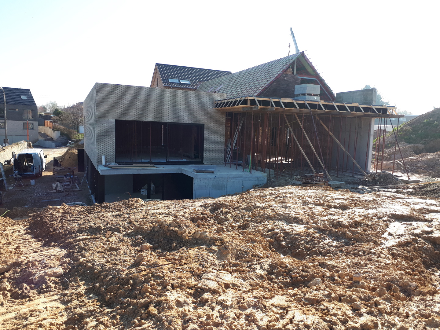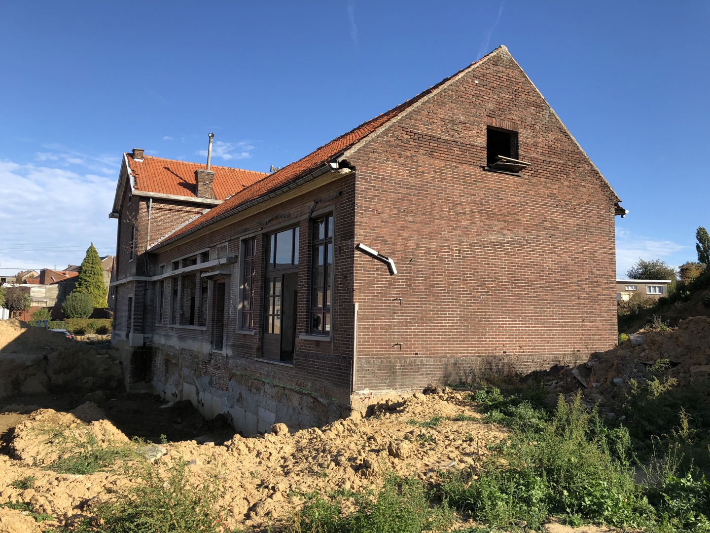 Een bijkomende uitdaging lag in de ondergrond met beperkte draagkracht. Binnen het bestaande volume plaatste het team micropalen, waarop een volledig nieuwe interne structuur werd gebouwd. De bestaande buitengevels bleven behouden, maar mochten geen extra belasting dragen. Aan de rechterzijde werd de gevel zelfs volledig onderschoeid om plaats te maken voor een nieuwe aanbouw.