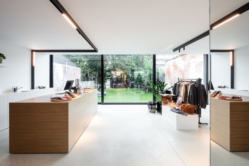 In tegenstelling tot klassieke winkels, die gekenmerkt worden door grote etalages aan de straatzijde, stond in dit project het respect voor de gevel centraal. Door het weghalen van de garagepoort kreeg de straat toch een nieuwe dimensie. Een driedelig schuifraam en veel openheid richting omgeving maximaliseren de relatie tussen de winkelruimte en de achterliggende tuin. Wanneer de glaspartijen worden opengeschoven, waant de shopper zich in de tuin. Dit creëert een gevoel van open air-shoppen. Kunstmatig licht in de winkelruimte werd tot een minimum beperkt en daglicht valt overvloedig binnen.