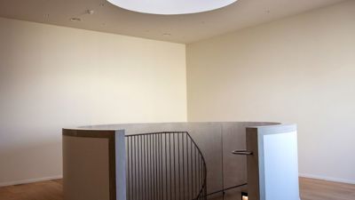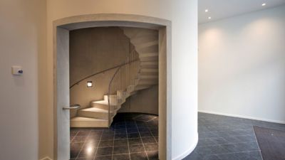 Wat Vandenhove vaker doet, is de trap geïsoleerd in de ruimte plaatsen, zodat het een apart object wordt. Het is draaitrap die de verschillende niveaus verbindt en het statische van de architectuur ook doorbreekt en zo een balans brengt. Door de trap zit de lift wat meer verborgen om ervoor te zorgen dat men in de eerste plaats de trap zou gebruiken.