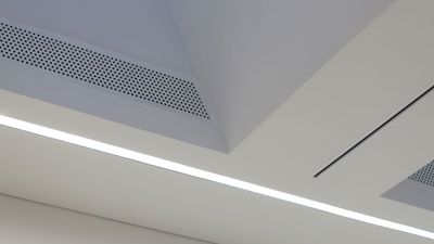 Opdat het auditorium en de tentoonstellingszaal niet zouden galmen als een kerk door de hoge beglazing, de harde parketvloer en houten wandbekleding en zitbanken, werd het plafond onzichtbaar bekleed met de marmerzandpleister BASWA Phon Fine van Sonogamma. Door de plaatsing van het innovatieve akoestische systeem wordt de verstaanbaarheid gegarandeerd en kan men in alle comfort hoorcolleges en exposities bijwonen en gaat alle aandacht uit naar de imposante kunstcollectie.