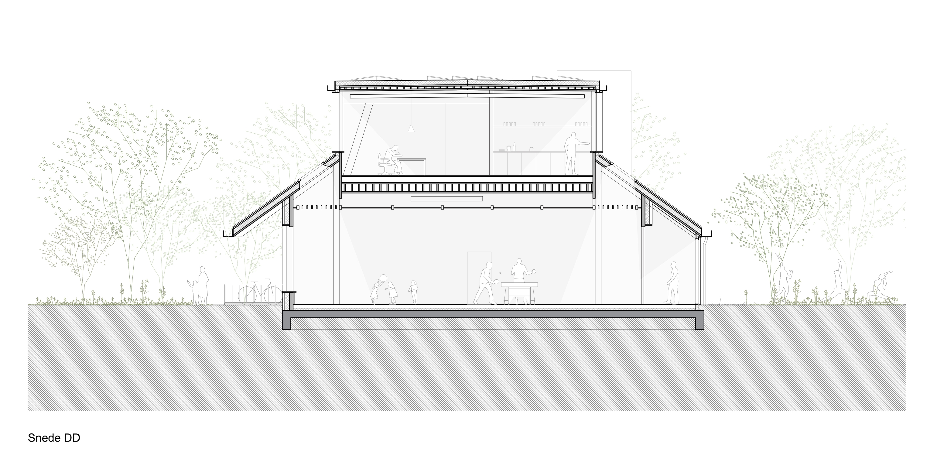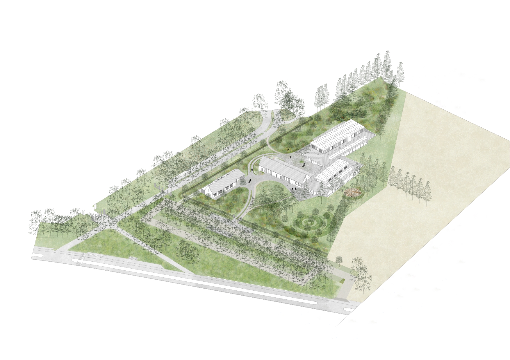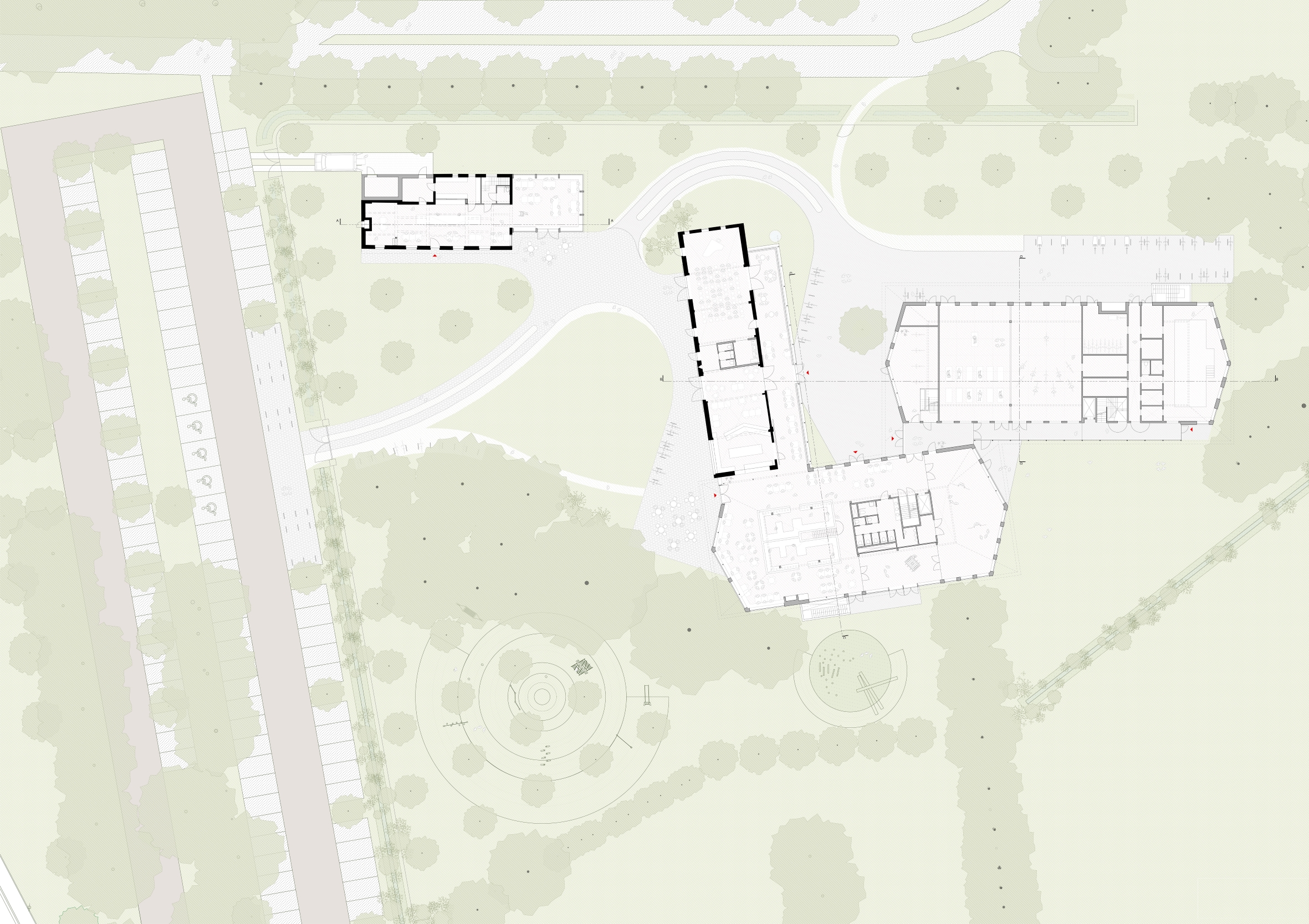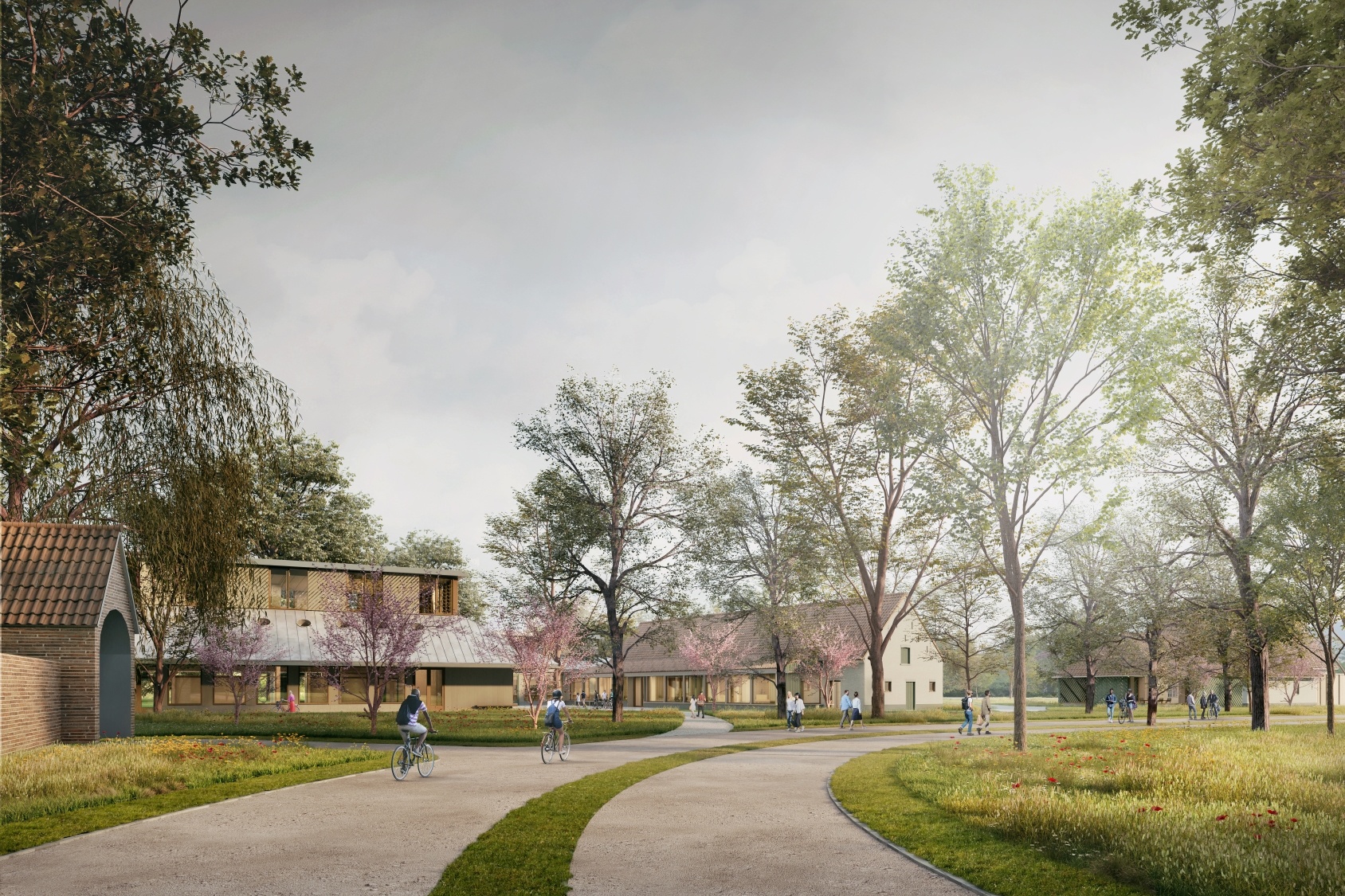 Twee nieuwbouwvolumes worden strategisch gepositioneerd achter de historische kern en vormen de ruggengraat van het nieuwe programma. Hun langgerekte vorm en repetitieve houten structuur zorgen voor overvloedig daglicht, een zachte overgang naar het omliggende groen en een groot aanpassingsvermogen op lange termijn. De gebouwen worden volledig in hout opgetrokken – met een combinatie van CLT, houten vakwerken, kanaalplaten en liggers – in samenwerking met aannemer Woema en stabiliteitsingenieur LABEAU. Hierdoor ontstaat een warme, tactiele architectuur met een uitgesproken circulair karakter.