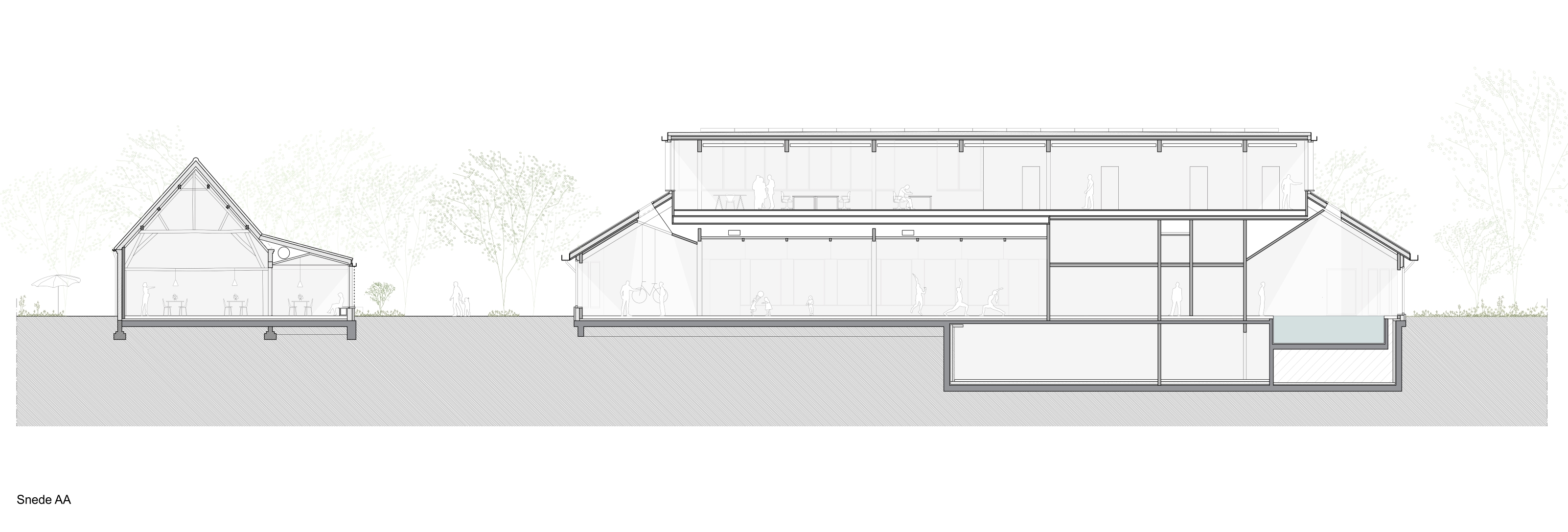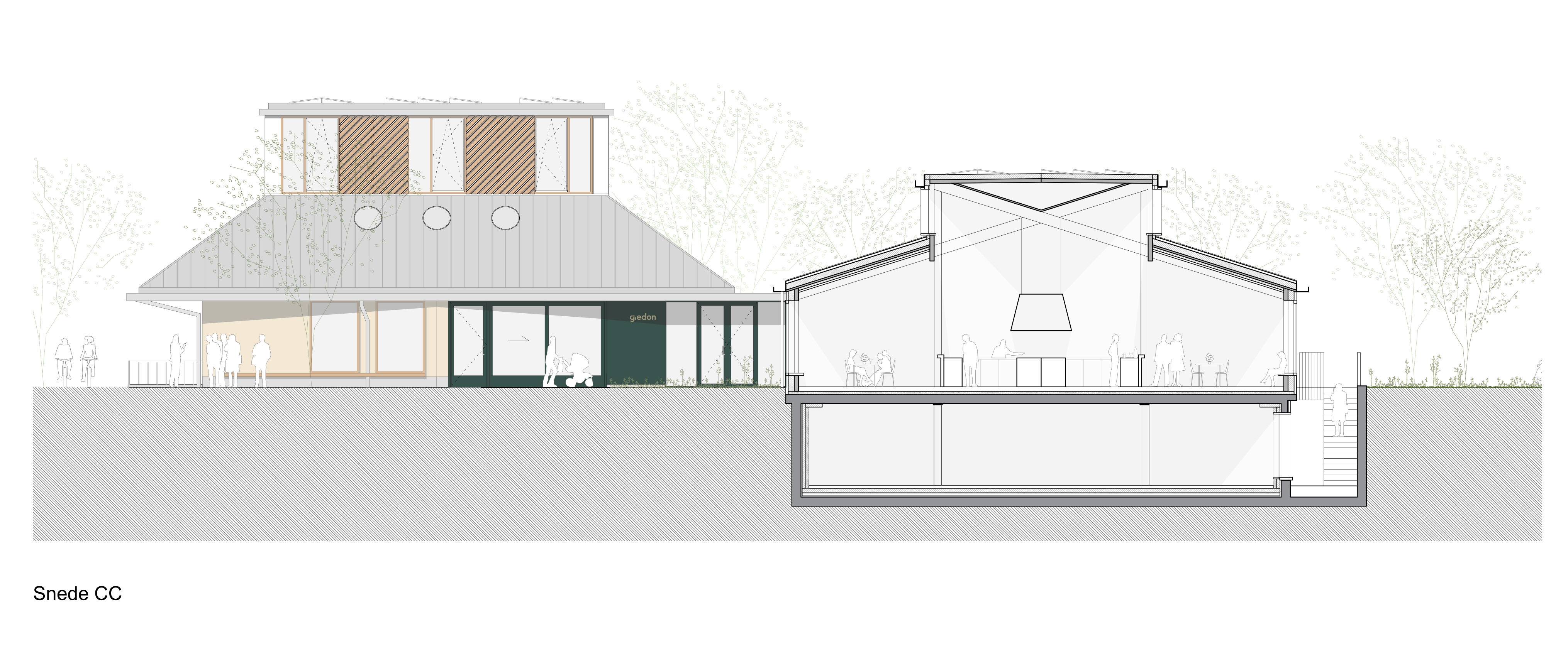 Veldhuis Architectuur koos voor een chirurgische aanpak waarbij respect voor het historische karakter hand in hand gaat met een heldere hedendaagse toevoeging. De karakteristieke schuur en het gasthof blijven behouden en worden zorgvuldig gerestaureerd. Aangroeisels uit de jaren ’70 en ’90 – die het beschermde dorpsgezicht visueel en functioneel verstikten – worden verwijderd, wat opnieuw ruimte creëert tussen de erfgoedgebouwen en het oorspronkelijke doorzicht herstelt. Zo krijgt de site haar openheid terug en ontstaat een aantrekkelijke ruimtelijke sequentie tussen oud en nieuw.