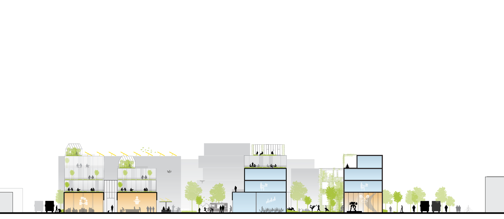 Dynamische interactie tussen binnen en buiten en tussen natuur en architectuur, kenmerkt deze beloopbare campus. Transparante plinten maken voorbijgangers nieuwsgierig naar wat zich afspeelt in de kantoren en labs, en speelse pixelvormige gevels met hoogteverschillen en groene loggia’s laten de overgang tussen gebouw en natuur vervagen.