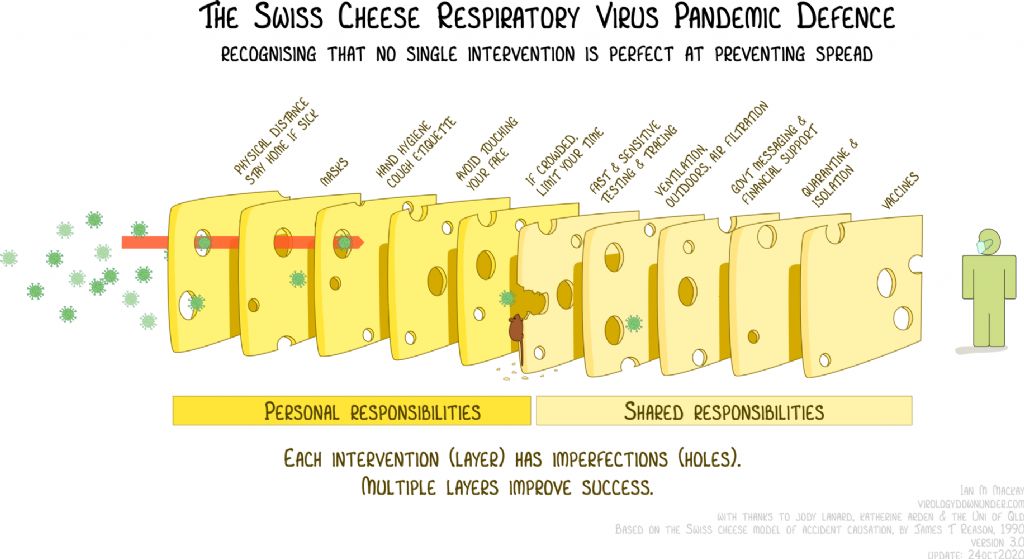 “Ventilatie is belangrijk, maar zeker niet het enige aspect”, klinkt het volmondig bij de experten. In het ‘Zwitserse kaas’-model is ventilatie slechts één van de vele sneetjes om de verspreiding van het virus tegen te gaan. Goede ventilatie moet dus nog enige tijd gepaard gaan met mondmaskers én afstand bewaren én een hoog vaccinatietempo.