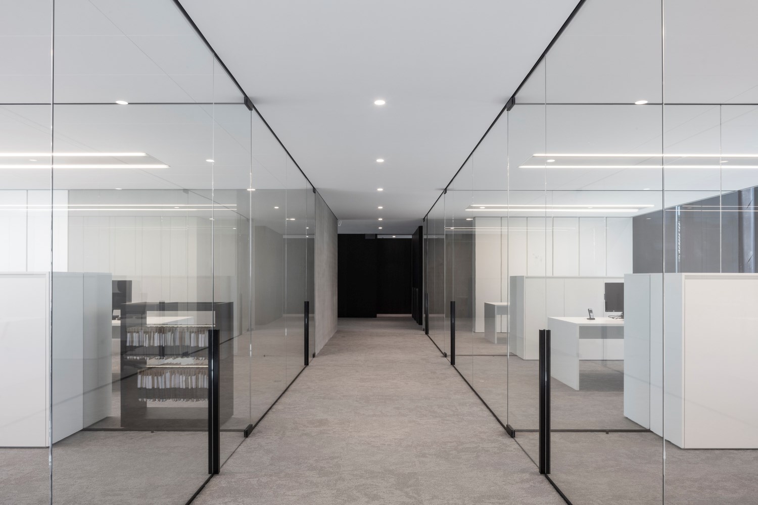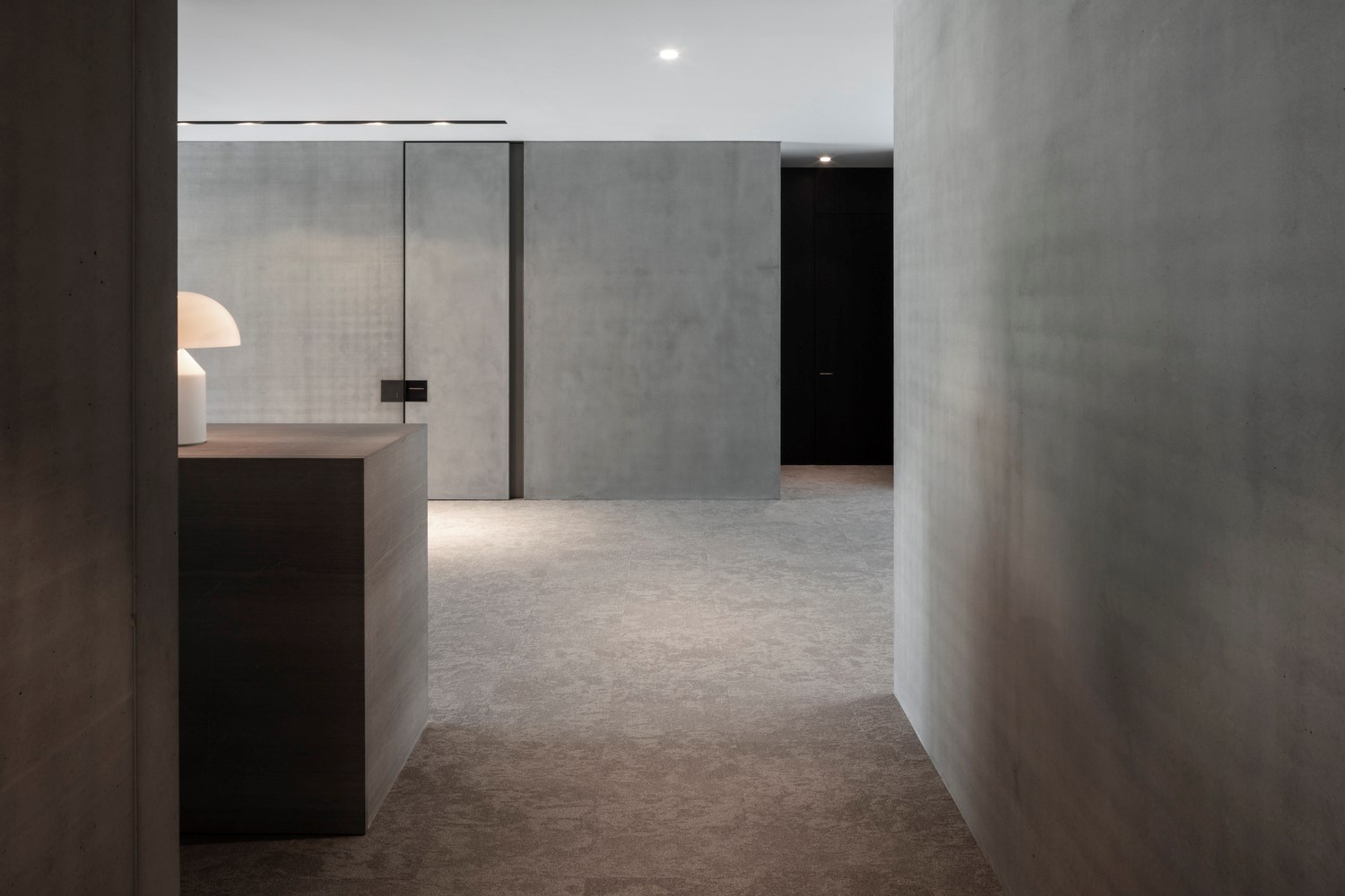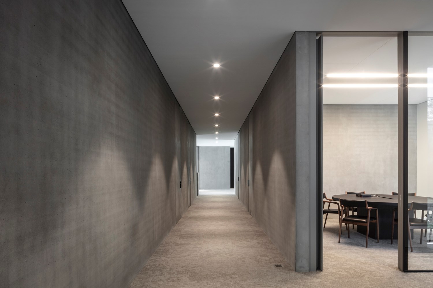 De verlichting speelt een belangrijke rol in het versterken van de rustige en professionele sfeer. Door de subtiele integratie van lichtbronnen in de architectuur worden zowel de vormen als de functies van de ruimtes benadrukt. De warme lichttinten creëren een aangename omgeving, terwijl de gerichtheid van de verlichting ervoor zorgt dat elk werkvlak optimaal wordt verlicht. Het resultaat is een harmonieuze balans tussen minimalisme en functionaliteit.
