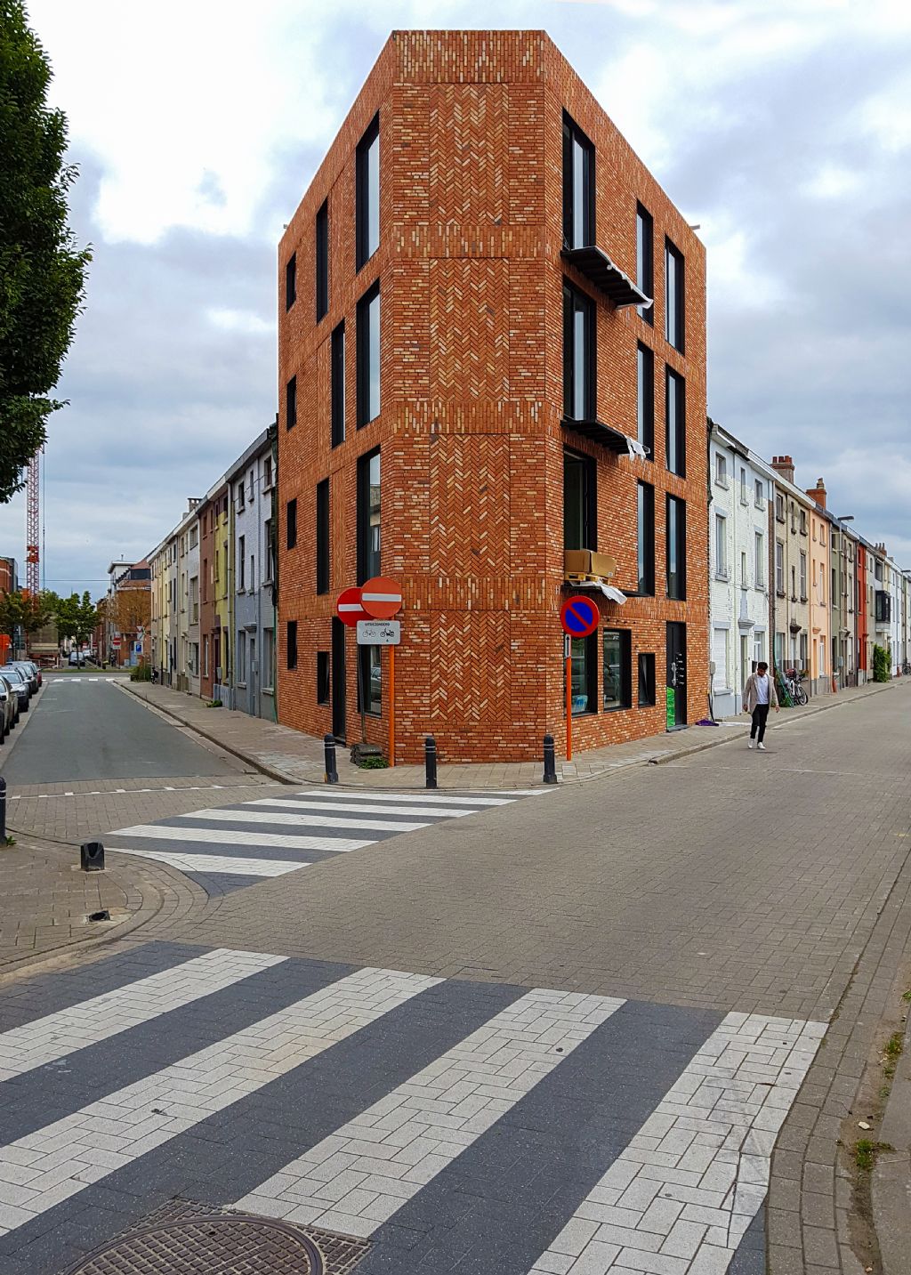 In de Brugse Poort in Gent hebben drie verwaarloosde hoekpanden plaatsgeruimd voor woonzorgproject The Lodge, waar mensen met een diagnose van autisme (weliswaar zonder verstandelijke beperking) in een aangepaste woning kunnen samenleven met ‘valide’ mensen in veertien zorgunits. Het ontwerp is van de hand van DENC!-STUDIO.
