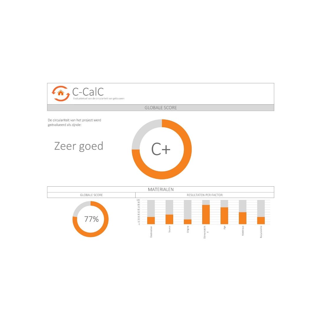 C-CalC voorziet ieder gebouw van een label, gaande van A, de beste score, tot H. Omdat die labels steeds op dezelfde manier worden berekend, kunnen gebouwen aan de hand van hun circulariteitsscore met elkaar vergeleken worden. Zo kan men gerichtere keuzes maken in het ontwerpproces.