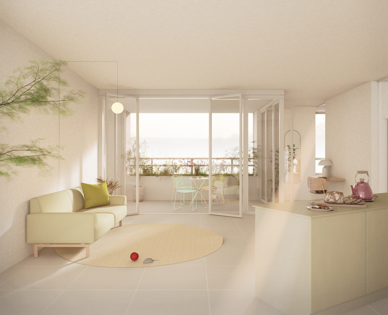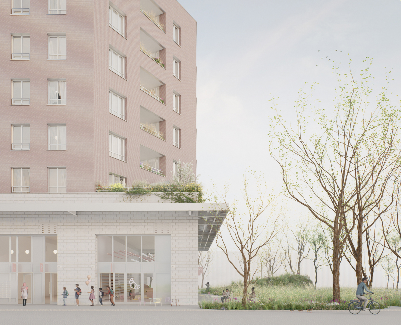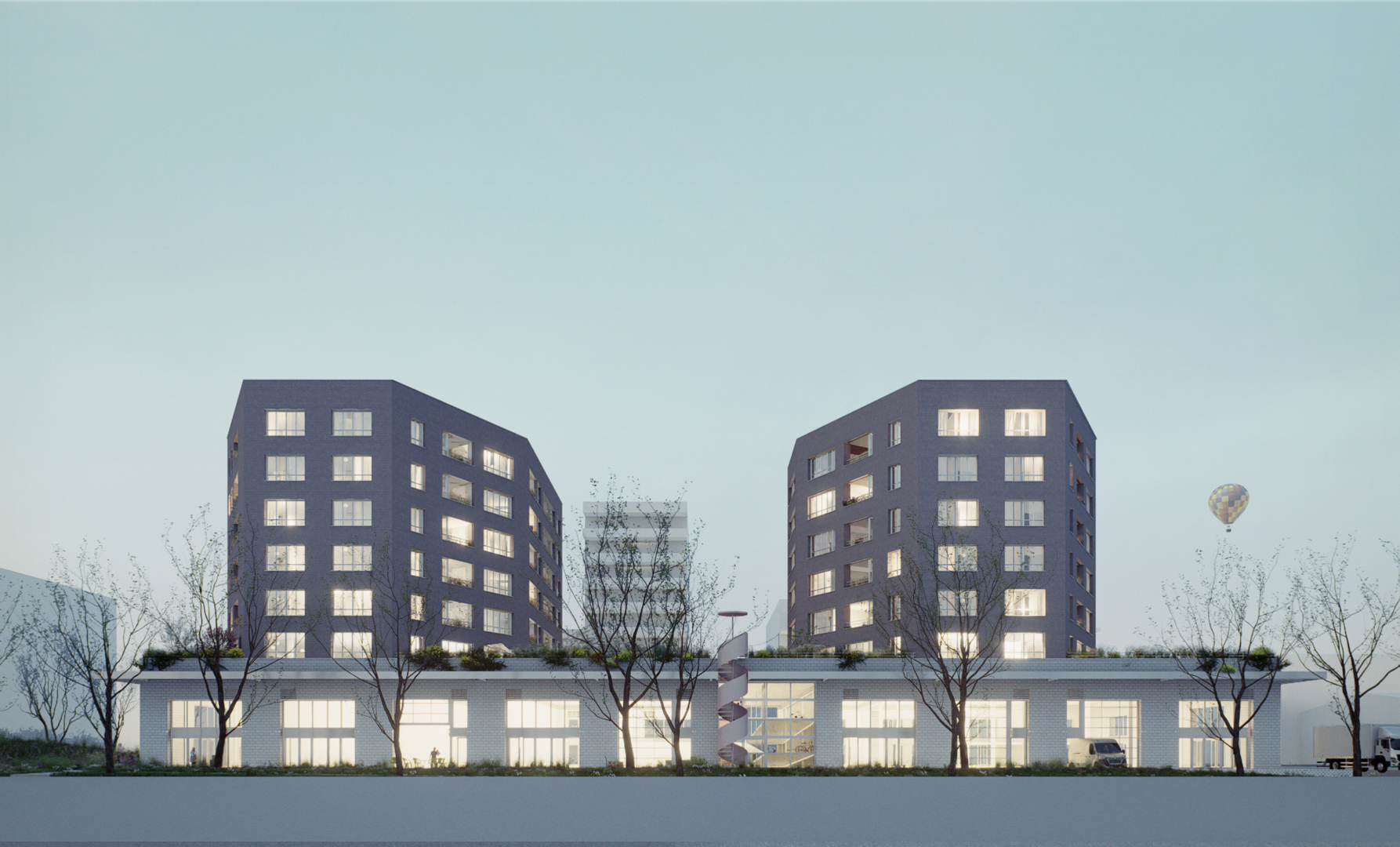 VIEW bevindt zich op een kruispunt van werelden: tussen het groene domein van Laken en de harde industriële as langs kanaal en steenweg. Die ligging vraagt om een architectuur die bemiddelt in plaats van scheidt. &bogdan en WITH20 ontwerpen daarom een gebouw dat zich laat lezen als een stedelijk weefsel — een samenhang van volumes, sferen en ritmes die industrie, wonen en natuur met elkaar verweven. De architectuur wordt zo een drager van verzoening: een brug tussen logistiek en leven, tussen grootstedelijke schaal en menselijke maat.