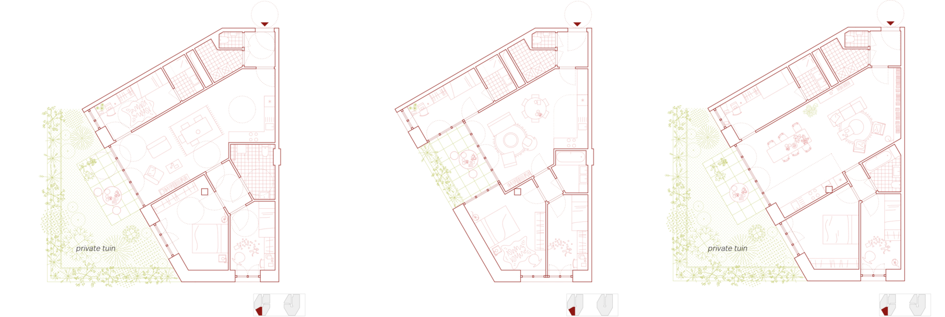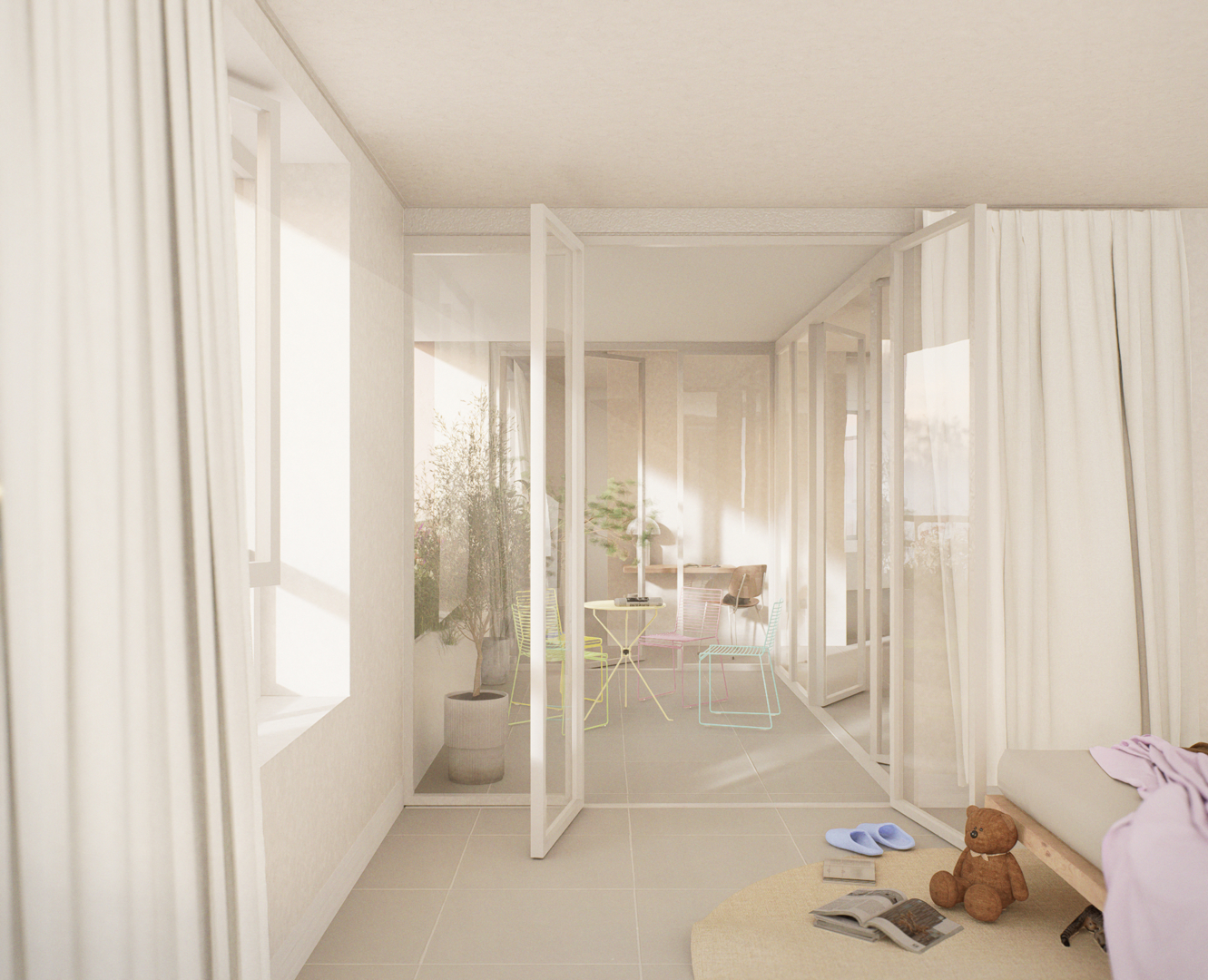De daktuin, serres en planters op en rond de woonvolumes verwijzen subtiel naar Euroveiling, de historische motor van de Belgische sierteelt die op dezelfde site actief blijft. Wat ooit louter productie was, krijgt zo een publieke, groene dimensie. De beplanting en wintertuinen brengen het florale DNA van de plek letterlijk terug in de stad. Bewoners, werknemers en bezoekers delen niet alleen het uitzicht en de buitenruimte, maar ook een dagelijks contact met natuur — een tastbare vorm van gedeelde stedelijkheid die ecologie koppelt aan sociale cohesie.