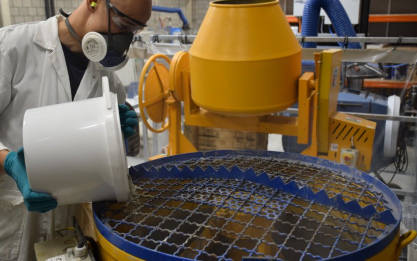 Het hoofdgedeelte van het ‘betonlabo’ van VITO huist in een ruimte van 150 vierkante meter. Daar staat de grootste apparatuur om het testbeton te mixen, te gieten of persen en te laten uitharden, waarbij het continu van nabij wordt bestudeerd. Meer gespecialiseerde tests worden uitgevoerd in twee aanpalende labo’s. “Het labo is eigenlijk niet nieuw”, zegt Warre Van Dun van VITO. “We hadden al testapparatuur maar die was eerder klein en beperkt, en bovendien waren de toestellen verspreid over verschillende locaties binnen VITO. Dat werkte niet erg efficiënt. Nu beschikken we over grote en gespecialiseerde apparatuur waarmee we ons kunnen meten met de toplabo’s.”