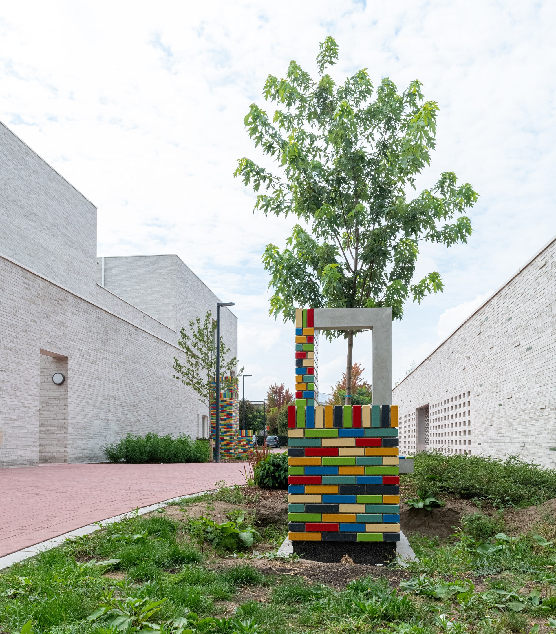 Langs de nieuwe publieke doorsteek tussen de Langemeersstraat en het Groeningepark staan vier monumentale kunstwerken verspreid opgesteld. De sculpturen zijn strak geometrisch opgebouwd in een subtiel evenwicht van vlakken en volumes, en hebben elk een eigen karakter. De ene is gesloten, de ander eerder landschappelijk of verheven. Henk Delabie (kunstenaar): “De kleurrijke architecturale constructies zijn bedoeld als ontmoetingsplekken. Je kan erop zitten, liggen, leunen. Ze nodigen je uit om deel te worden van de sculptuur. Ze prikkelen de voorbijganger door zowel de kleur, vorm en verhoudingen als door het glanzend oppervlak die tactiel aanvoelt.”