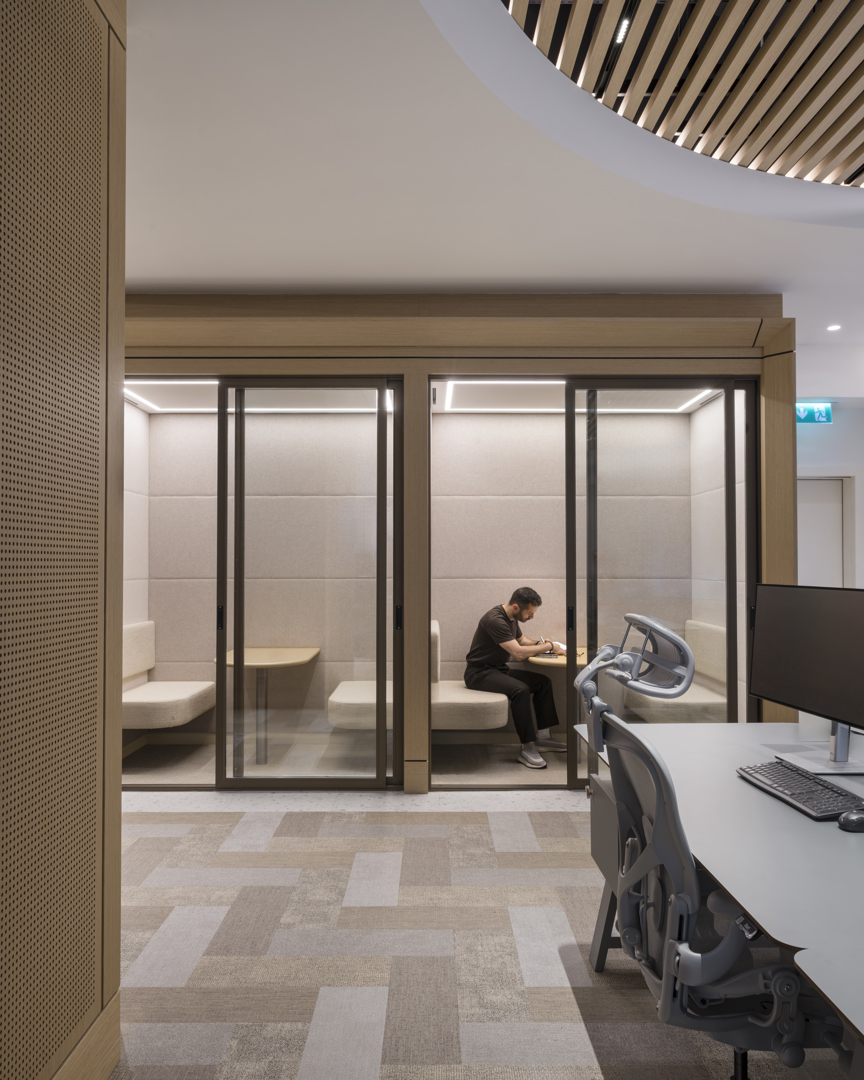 "Ze zijn een van de belangrijkste ontwerptools: ze brengen warmte, definiëren zones en verzachten de akoestiek op een manier die zowel comfort als concentratie ondersteunt. Door het gebruik van geometrische patronen en subtiele kleurvariaties ontstaat bovendien een visueel ritme dat gebruikers doorheen het gebouw begeleidt", legt de architect uit.