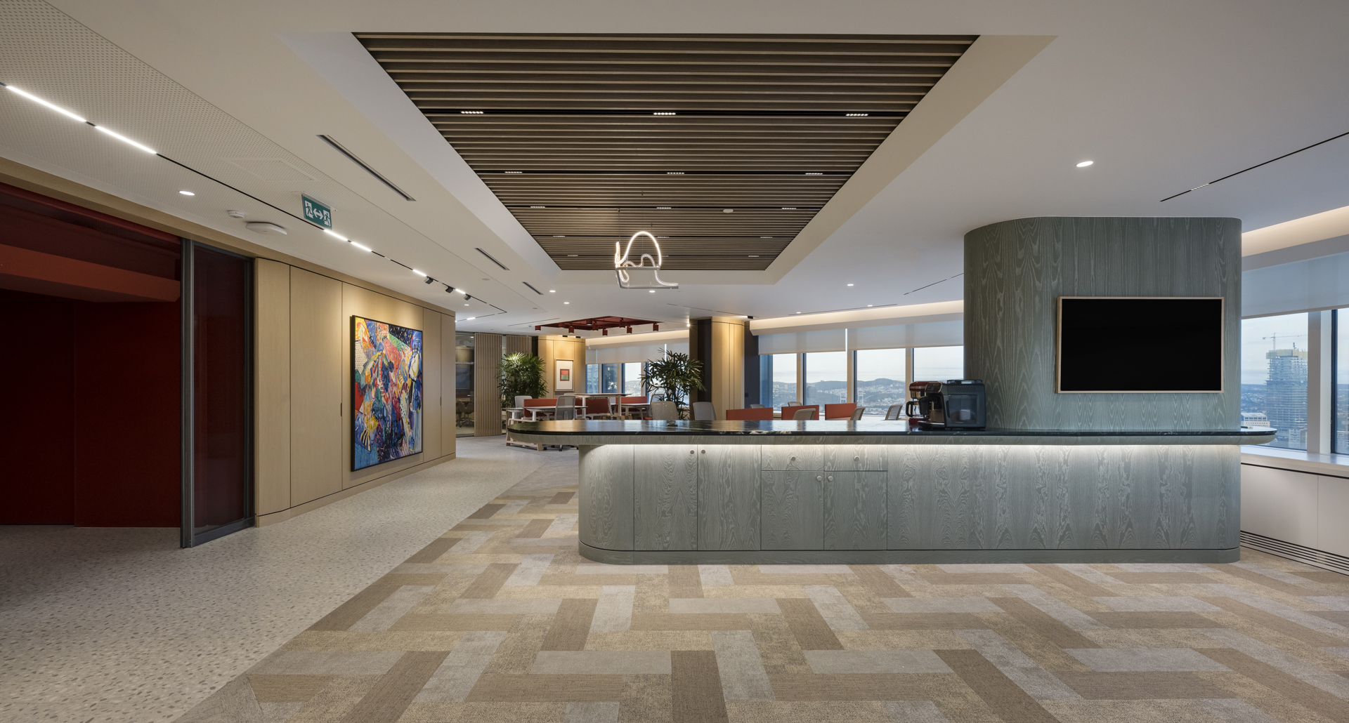 In het Akbank-hoofdkantoor vertaalt zich dat in een vloersysteem dat zowel richting geeft als samenhang creëert. Daarnaast draagt de vloerafwerking bij aan de akoestische kwaliteit van de werkomgeving, wat essentieel is in een gebouw met een hoge dagelijkse bezetting.