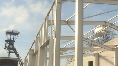 Het vermijden van materialen - dematerialisatie - is volgens a-tract architecture cruciaal bij circulair bouwen. “Het meest ecologische materiaal, is het materiaal dat je niet nodig hebt”, klinkt het. Daarom wordt zowel op het gelijkvloers als op de verdieping de betonvloer onmiddellijk gepolierd, zonder verdere afwerking. En de stalen dakplaten worden in een geperforeerde versie gekozen waardoor er geen extra akoestische materialen nodig zijn. De stalen portieken, die de volledige 24 meter in één keer overspannen, zijn aan mekaar gebout en voor de bevestiging van de stalen dakplaten op die portieken is gekozen voor intermediaire stalen plaatjes. Hierdoor kan ook dit steeldeck achteraf makkelijk gedemonteerd worden.