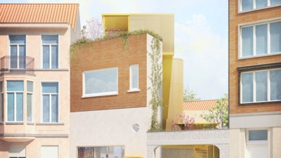 Aan de tuinzijde wordt een volumetrische kopie van de middenbeuk van het kerkschip voorzien, zich vleiend langs de zijgevel van het kerkgebouw. Als eigentijdse en lichtrijke dubbelganger van het bestaande in essentie lege volume, is dit nieuwe element een open structuur met plateaus op verschillende niveaus, evolutief van aard, dat alle kwaliteiten voorziet voor stimulerende, comfortabele en eigentijdse werkplekken.