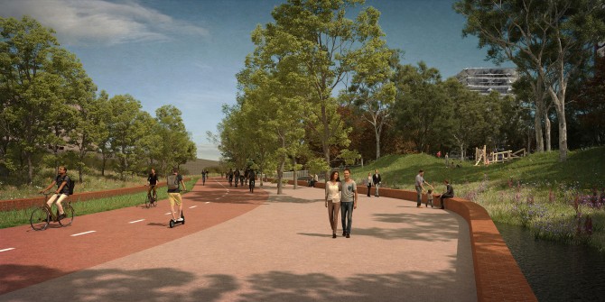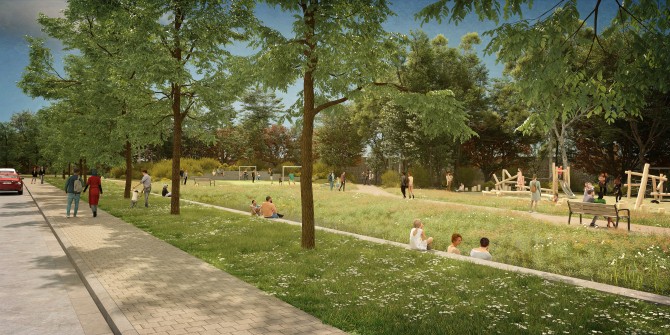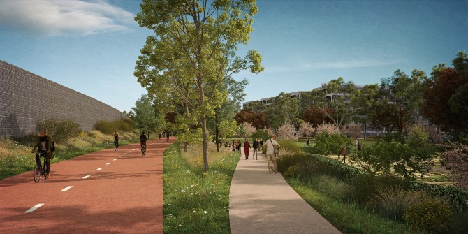 Het voorontwerp stelt voor om de muur te bekleden met groene bermen om een sterker parkgevoel op te wekken. Behalve een nieuw ontwerp voor de volkstuinen en de hondenweide is er ruimte voor een lokale evenementenzone, water, en een speelzone.