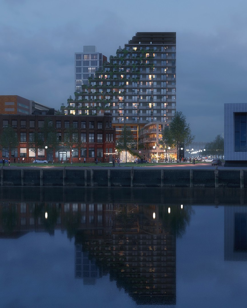 Uiterlijk zullen vooral de groene gevels de nieuwe woontoren kenmerken. Die worden gevormd door maar liefst zeshonderd strekkende meters aan vaste bloem- en plantenbakken. Stadsecologen en biologen werden betrokken bij het kiezen van de bloemen en planten. Zij kozen de flora in functie van onder meer de zonoriëntatie van elke gevel en de diersoorten – vlinders, vogels, vliegen en kruipende insecten … – die er worden door aangetrokken. Op en aan de woontoren komen zo’n 140 nestkasten voor vogels en vleermuizen, met op het dak een echt penthouse voor de slechtvalk – een vogelsoort die Rotterdam graag aandoet gezien de vele hoge gebouwen om op te nestelen. De groene gevels zullen dus bijdragen aan de biodiversiteit in de stad.