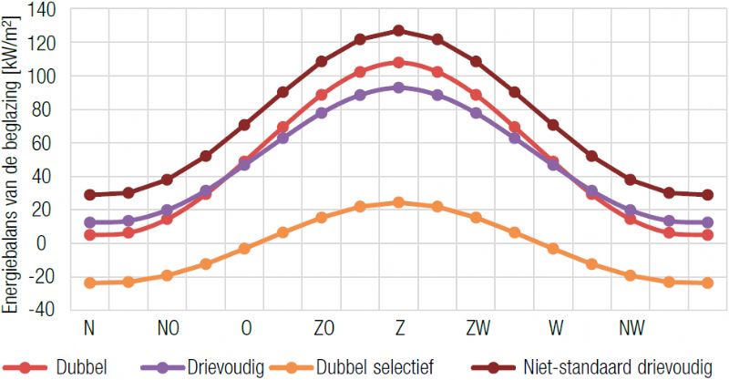 Tweede vaststelling: voor een zuidelijke oriëntatie is de balans van de standaard dubbele beglazing gunstiger dan die van de standaard drievoudige beglazing; voor het oosten en het westen zijn deze twee beglazingen evenwaardig en in het noorden vertoont de drievoudige beglazing een betere balans dan de dubbele. Hierbij dient echter opgemerkt te worden dat de warmtewinsten beperkt zijn en slechts 10 % van de in het zuiden behaalde winsten vertegenwoordigen. De balans van de dubbele selectieve beglazing is steeds ongunstiger, terwijl die van de niet-standaard drievoudige beglazing altijd gunstiger is.