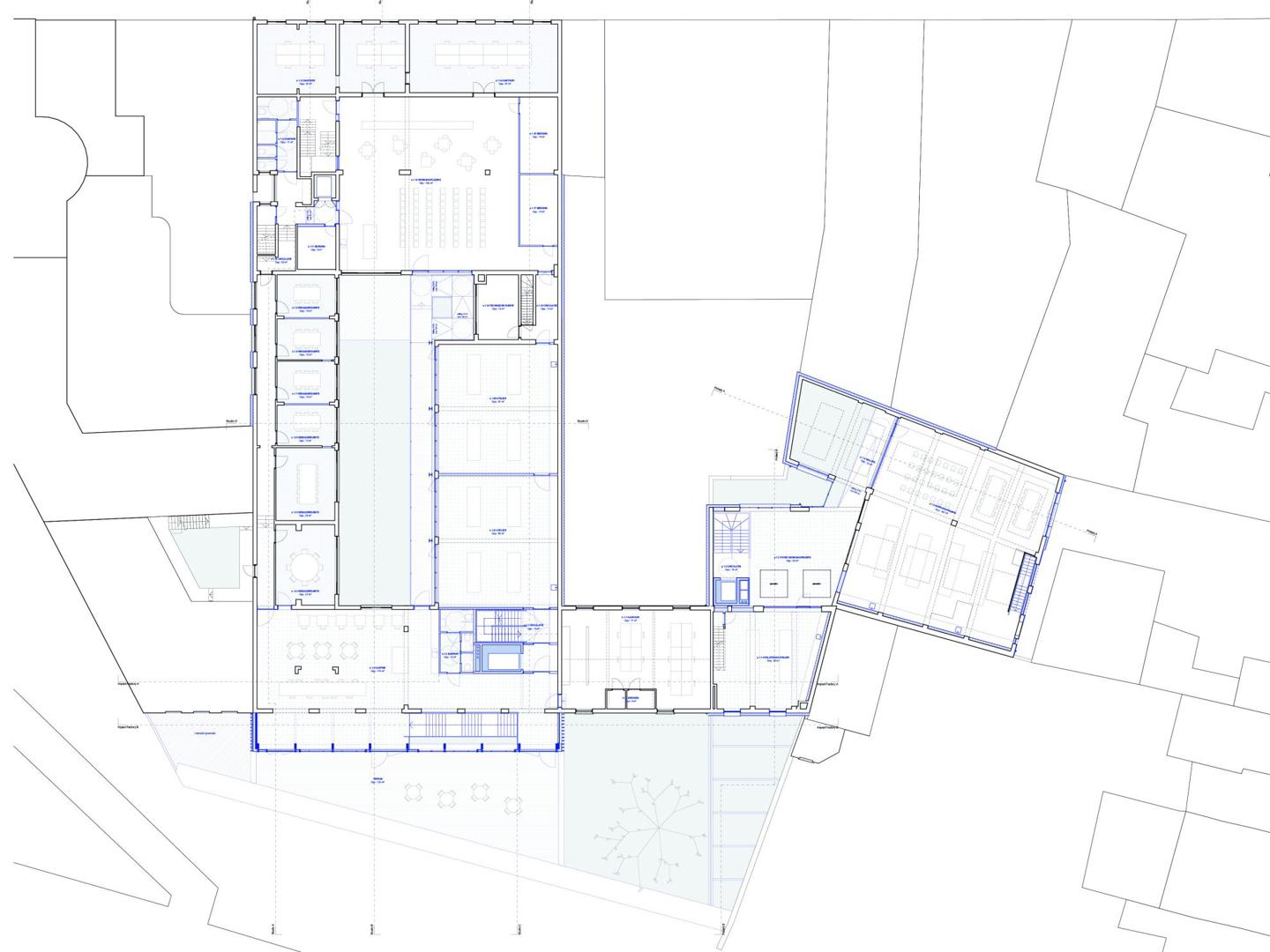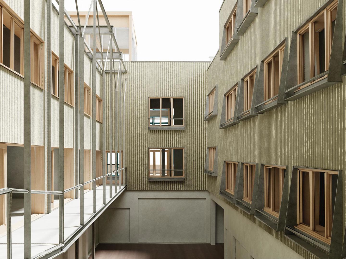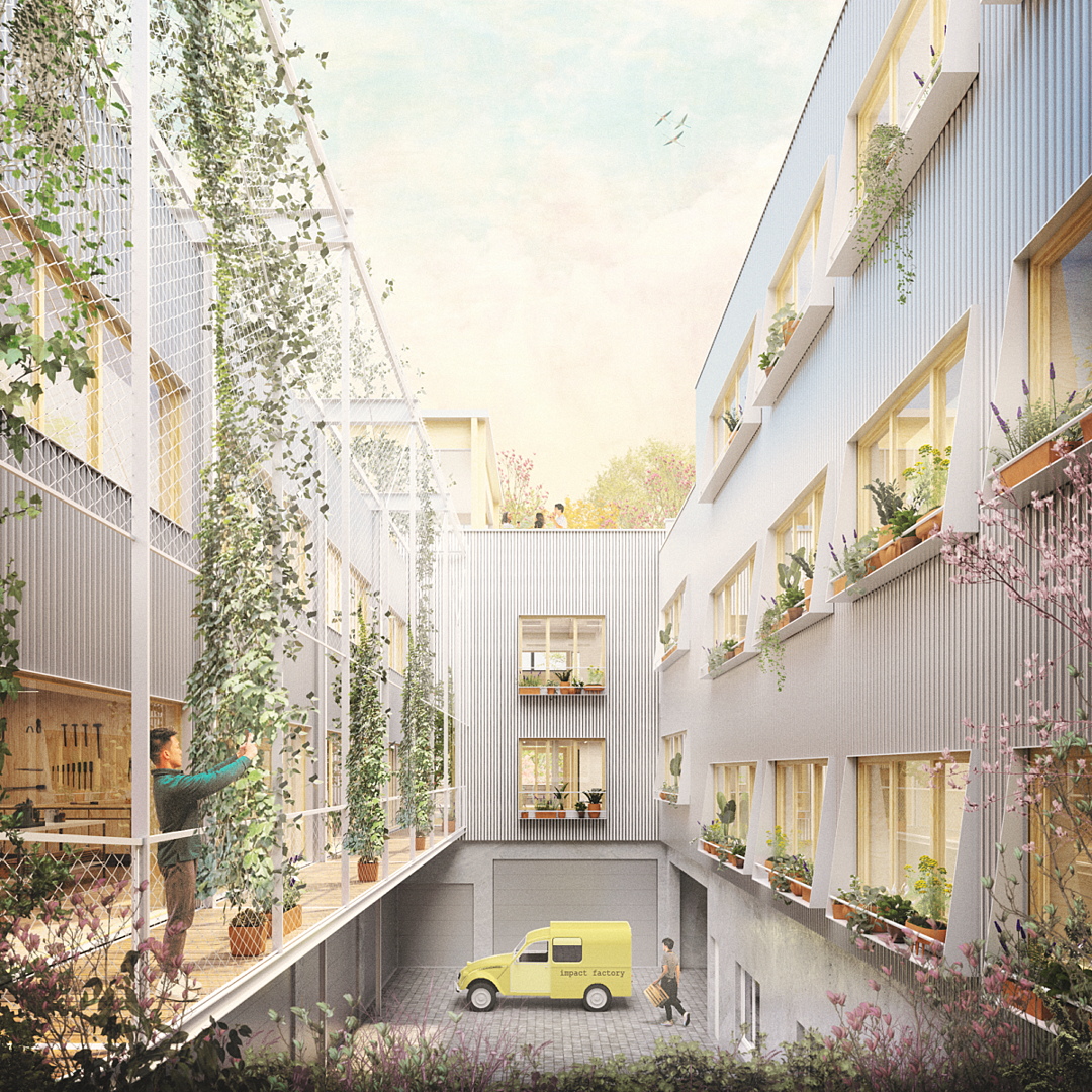 Het concept voor de site vertrekt vanuit de gedachte dat de Impact Factory er in essentie al is en niet volledig nieuw gebouwd hoeft te worden. Er wordt resoluut gekozen voor maximaal behoud en minimale interventie, waarbij circulaire bouwprincipes de leidraad vormen voor elke ontwerpkeuze doorheen het proces. In de Studio wordt de bestaande structuur benut door kantoren en werkruimtes te organiseren rond een nieuwe galerij aan de zuidgevel. Die ingreep lost de beklemmende interne circulatie op en dient tegelijkertijd als zonnewering voor de ateliers. Terwijl de noordzijde een grote ruimte vormt met ramen op het zuiden, is de zuidzijde opgedeeld in kleinere kamers die profiteren van een doordachte lichtinval.