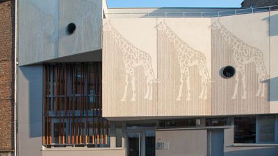 De straatgevel van het kinderdagverblijf toont het openbaar karakter van de inrichting. Hij bestaat voornamelijk uit hout en beton. Er werd een specifieke bekisting geplaatst om in het beton een speels motief in girafvorm te integreren dat de verbeelding van de kinderen zal stimuleren. Een houten claustra waarborgt de privacy van een deel van de vertrekken en brengt tegelijk een zekere warmte, terwijl de voor het merendeel volle betonvlakken hier en daar doorboord zijn met ronde openingen.
