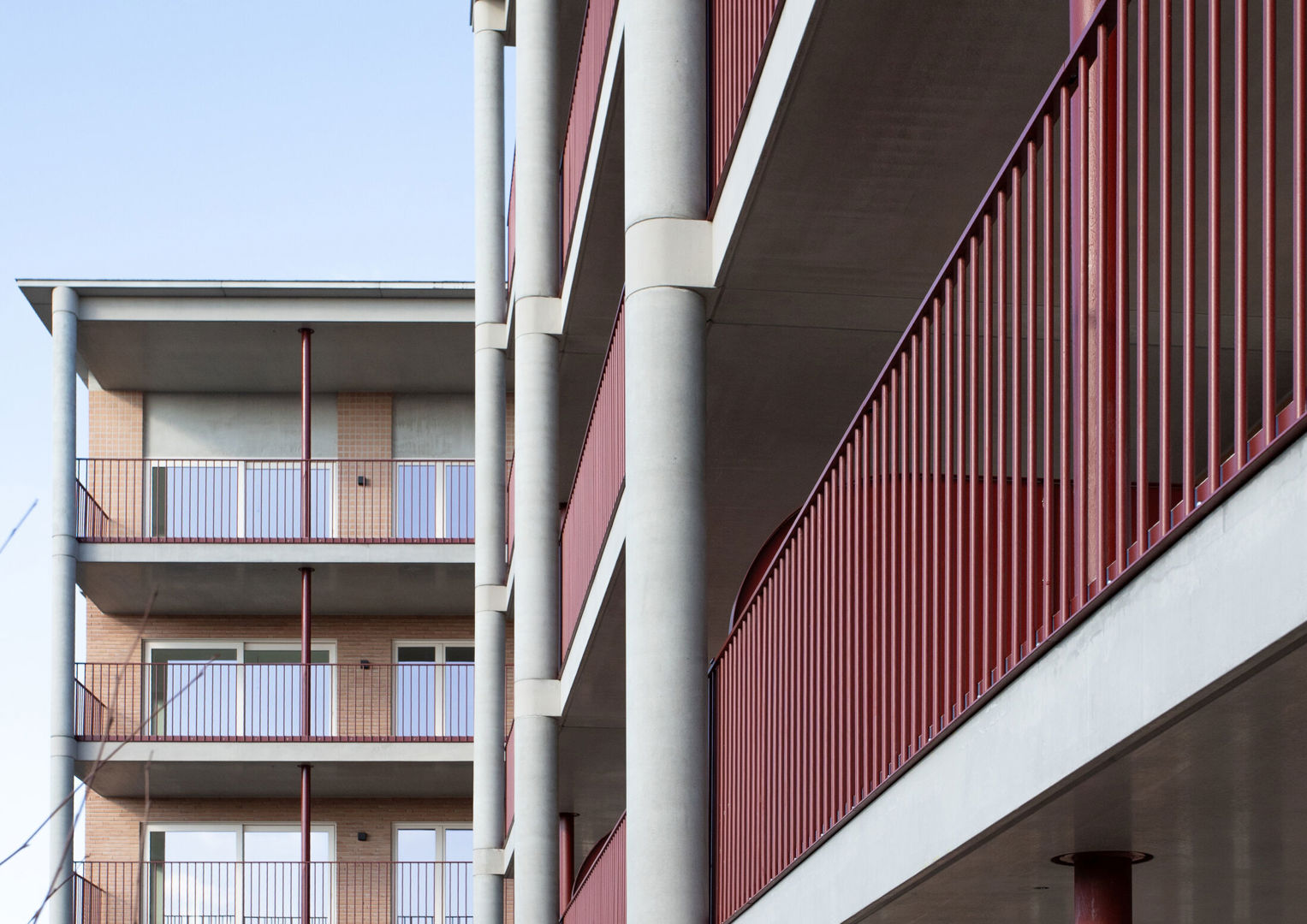 De aandacht voor materiaal zet zich door in de detaillering. Ramen, balustrades en terrassen maken integraal deel uit van het architecturale concept. Slanke profielen en zorgvuldige aansluitingen zorgen voor een verfijnd beeld dat de robuustheid van de baksteen nuanceert.