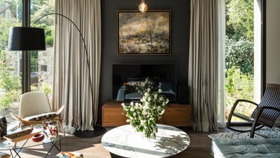 Het hout werd ook gebruikt voor de vlonders aan de buitenkant van het huis en komt ook uitgebreid terug in het interieur, waaronder de trap en de keuken. Deze continuïteit van het materiaalgebruik in de verschillende ruimten van het huis weerspiegelt de esthetische gevoeligheid van de huiseigenaren. In combinatie met de aangelegde, met bomen omzoomde tuin waarin het huis staat, geeft dit een gevoel van harmonie aan het ontwerp en levert het een ingetogen maar intieme woning op.
