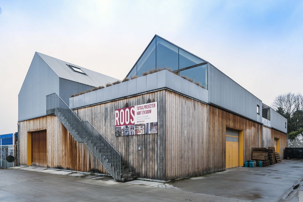 Toen Jeroen Roos en Nadja De Moor, eigenaars van totaalprojecten Hout en Bouw Roos, op zoek gingen naar een locatie voor een nieuwe schrijnwerkersloods, wisten ze niet dat hun noden en wensen zouden resulteren in een voorbeeldproject wat betreft ruimtelijk rendement. Daarenboven etaleert het project het kunnen van het bouwbedrijf. “Onze ambachtelijke schrijnwerkerij zag het levenslicht in 1918”, steekt Jeroen Roos van wal. “Sinds 2012 nemen we ook algemene aannemingswerken voor onze rekening waardoor we ons vandaag graag als algemeen hout- en bouwbedrijf bestempelen. Een groeitraject dat ons in 2011 noopte tot een zoektocht naar extra opslagruimte. Als Oudenaards bedrijf belandden we al vlug in de ambachtelijke zone aan de Neringstraat waar een vervallen pand te koop stond. Na aankoop kwamen we snel tot twee opties: grondig renoveren of nieuwbouw. De keuze viel uiteindelijk op afbraak en een nieuwbouwloods.”