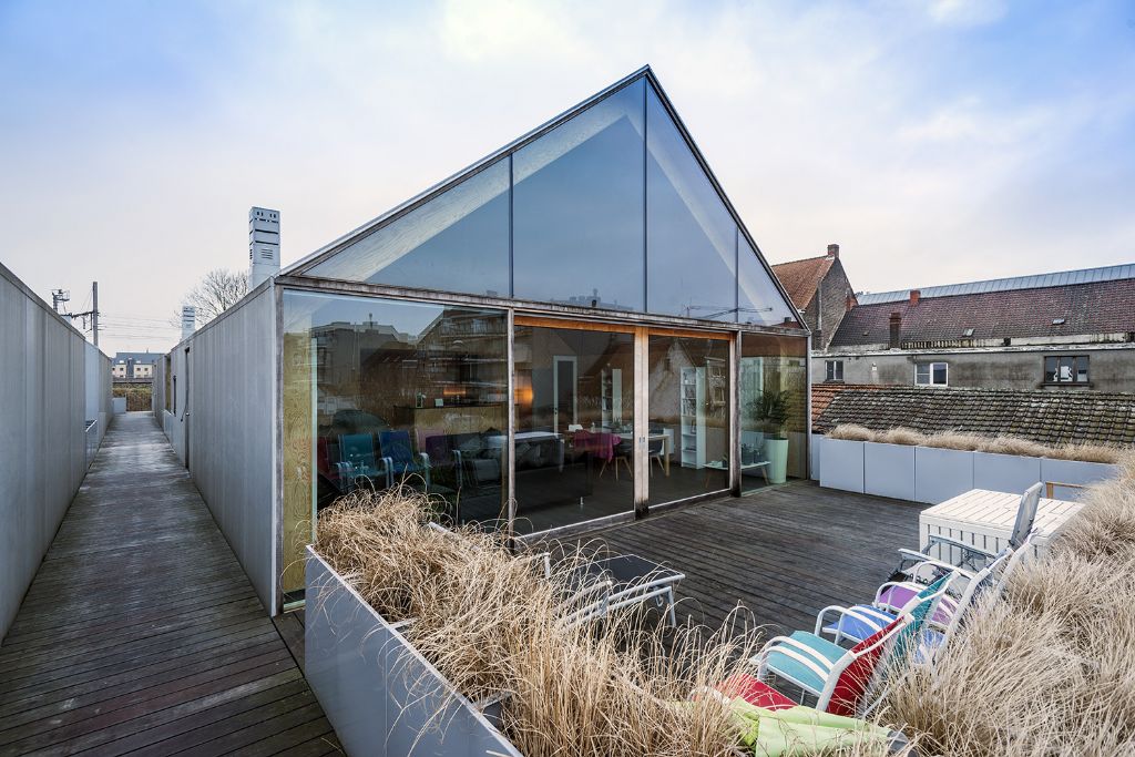 Op het dak vinden we vier woningen terug met een elk een oppervlakte van 115 vierkante meter en een ruim terras van 35 vierkante meter. Op deze manier sluiten wonen en werken perfect op elkaar aan. Overdag vindt er bedrijvigheid plaats in de loods als de bewoners werken zijn. ’s Avonds en tijdens de weekends genieten de bewoners van een prachtig zicht en een ruim terras op een boogscheut van het centrum. De archetypische huisvorm vloeide voort uit de voorschriften. Seger Delmulle: “De kroonlijsthoogte ligt vast op 7 meter hoogte, de nokhoogte mag 10 meter hoog zijn. Doordat de loods op vraag van de bouwheer minimaal 4 meter hoog moest zijn, bleek de typische woningvorm met hellend dak de ideale oplossing.”