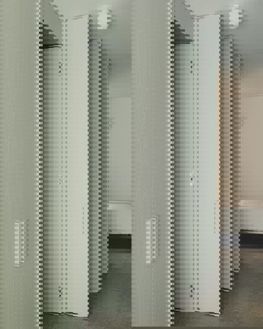 Via een grote pivotdeur kan de hoofdslaapkamer worden afgesloten of juist verbonden met de leefruimte. Zo ontstaat een flexibele plattegrond die zich aanpast aan de behoefte van het moment: open en loftachtig bij samenzijn, meer afgeschermd bij nood aan privacy. Door gangen te vermijden en functies te integreren in meubels, blijft elke vierkante meter optimaal benut — zonder in te boeten op rust of ruimtelijkheid.