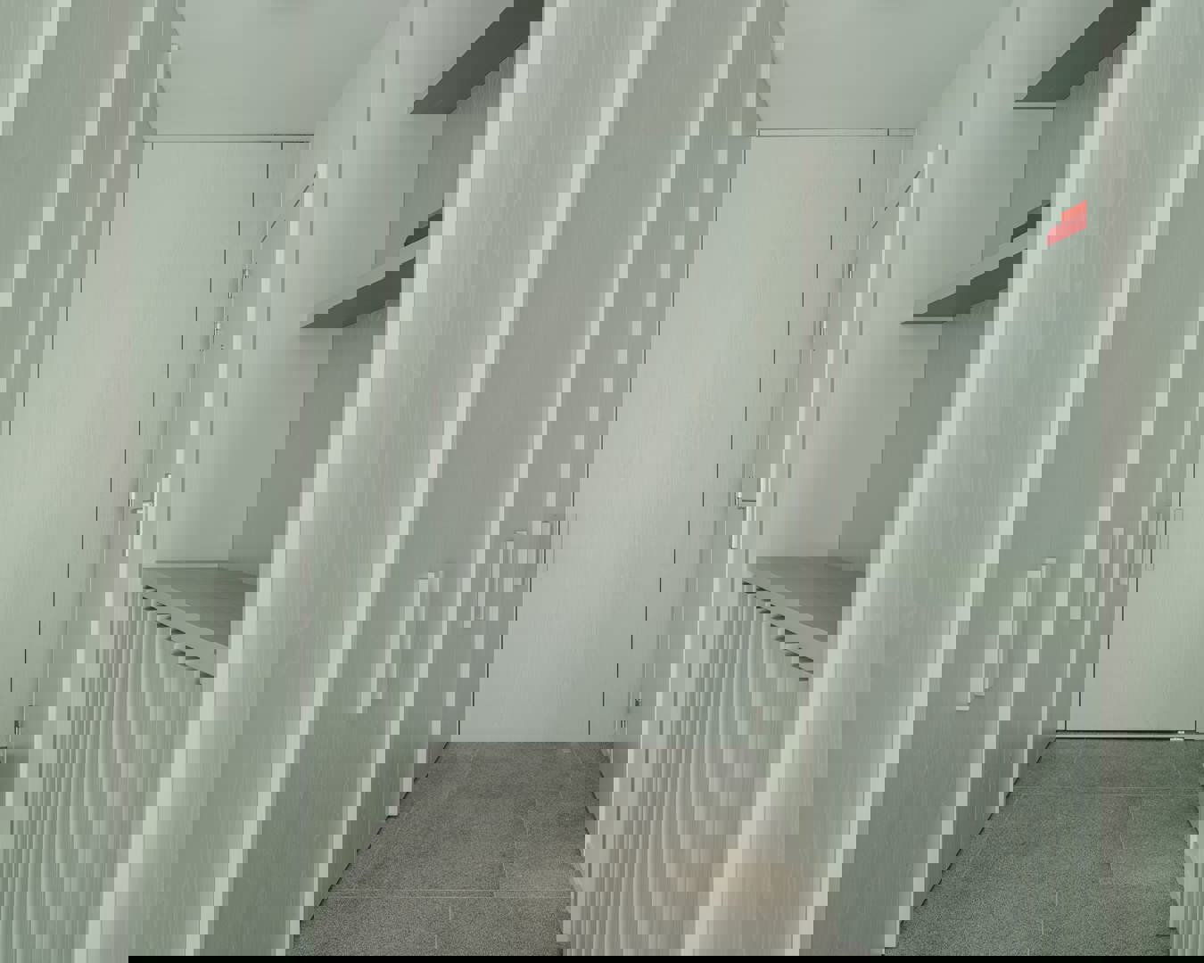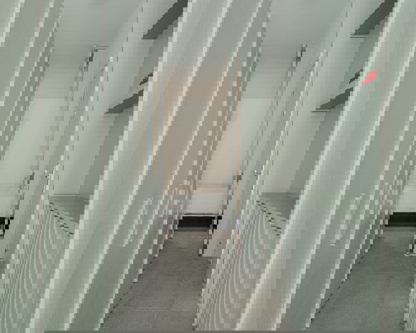Een opvallend en speels aspect van het ontwerp is de manier waarop de circulatiezones in de kastwanden zijn geïntegreerd. De lange kaststructuur vormt niet alleen een visuele as, maar verbergt ook een ‘geheime’ doorgang naar een nachthal die leidt naar de badkamer, extra opbergruimte en een compacte tweede slaapkamer. Die laatste is uitgerust met drievoudig gestapelde bedden — een slimme en efficiënte oplossing die herinnert aan scheepsinterieurs en logeerplekken voor kinderen.