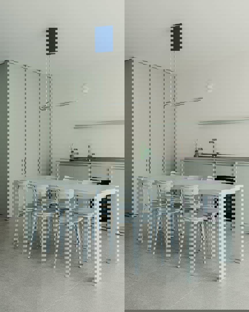Midden in de flat staat een lange, lichtblauwe tafel – een ontwerp van Studio Jan Vermeulen en Atelier Ternier – die dienstdoet als eetplek, werkplek en ontmoetingspunt. Rondom de tafel is ruimte voor acht tot tien personen, perfect voor zomerse apero’s of winterse diners. De kleur sluit naadloos aan bij het zachte kleurenpalet van de kust, terwijl de vormgeving rust en openheid uitstraalt. De tafel vormt het kloppend hart van het appartement, letterlijk en figuurlijk.