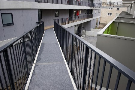 Het diverse aanbod aan appartementen waarvan een groot aantal levensloopbestendig en/of aanpasbaar zijn, is zeker een troef. Door de loopbruggen zijn alle appartementen bereikbaar met de lift. De zuidelijk gerichte privé-terrassen en de groene inrichting van collectieve buitenruimten zorgen voor een aangenaam leefklimaat. Alle appartementen zijn voorzien van individuele warmtepompen en vloerverwarmingssystemen die kunnen worden omgeschakeld naar vloerkoeling om het wooncomfort te vergroten. Door de speelse toepassing van gekleurde balustrades, de zwevende passerelles en kleuraccenten springt dit gebouw in het oog langsheen de veeleer saaie en drukke steenweg.