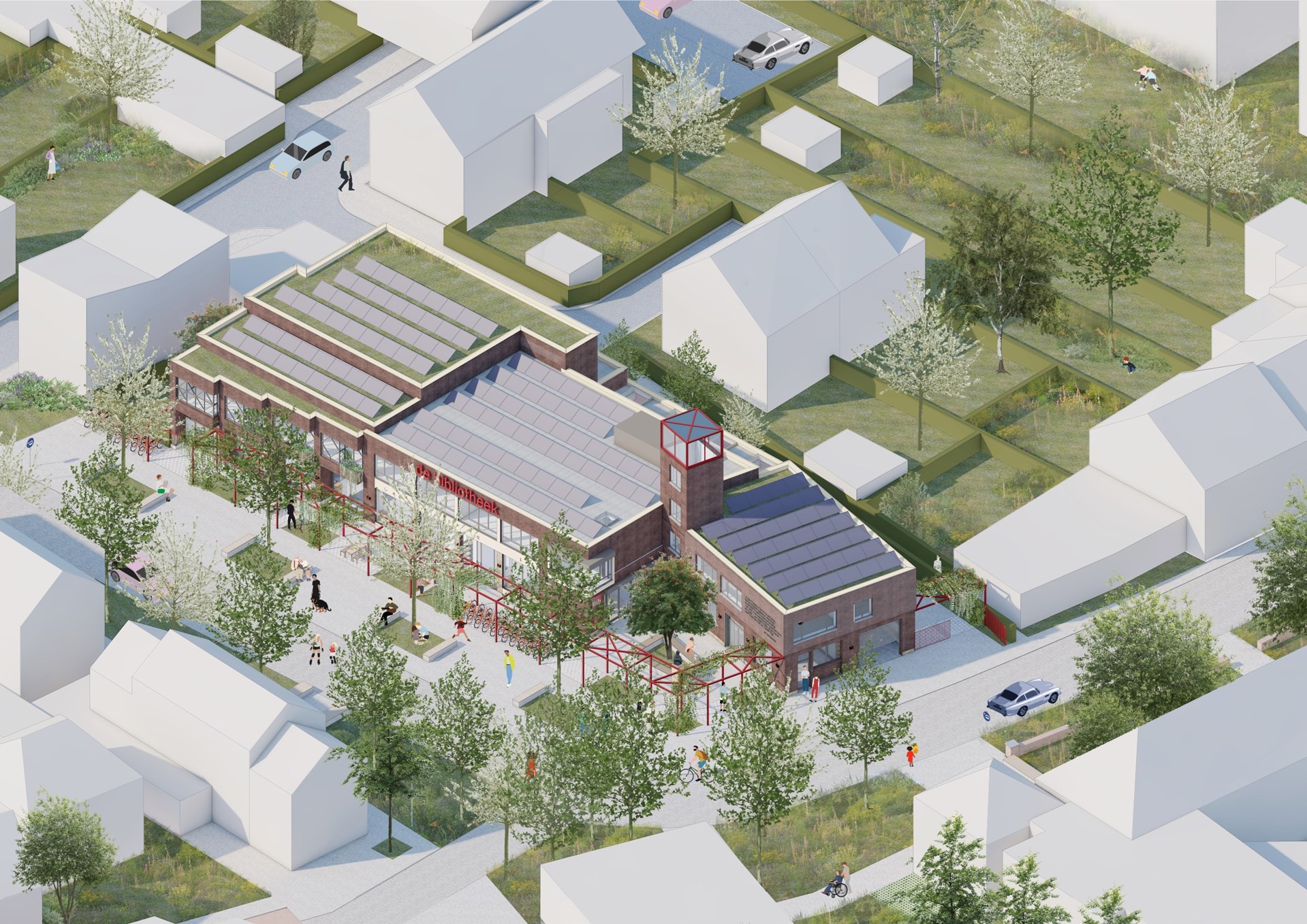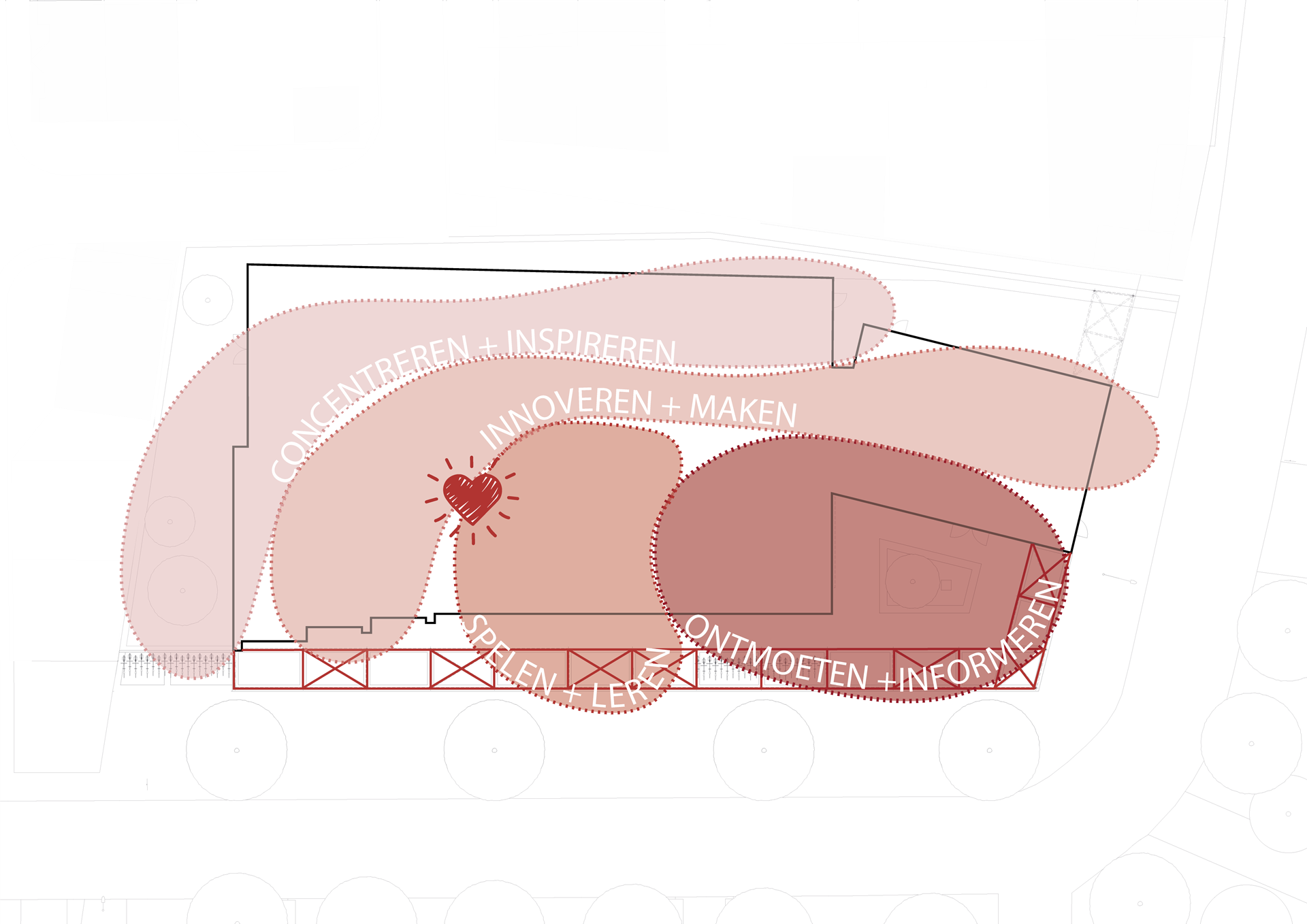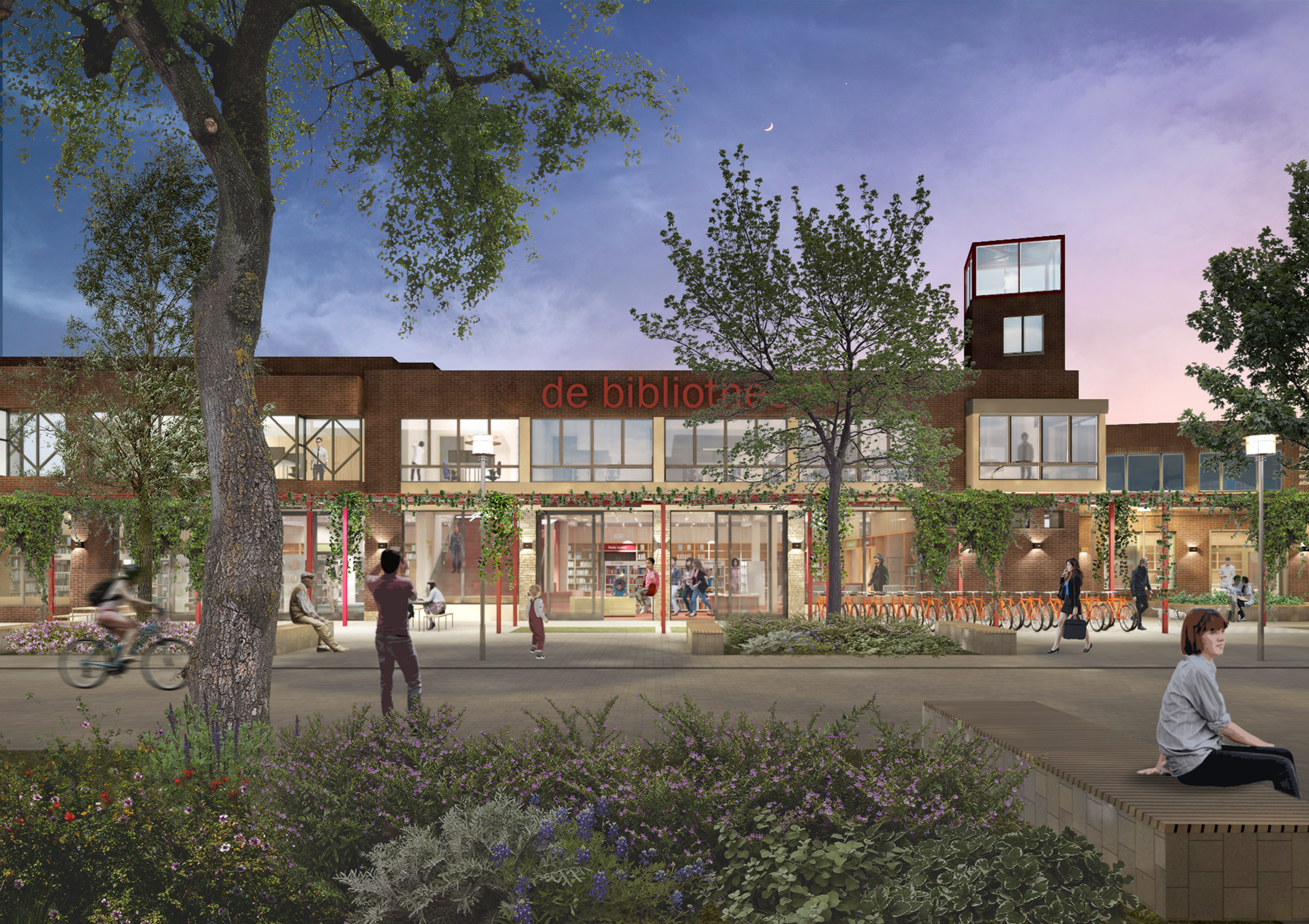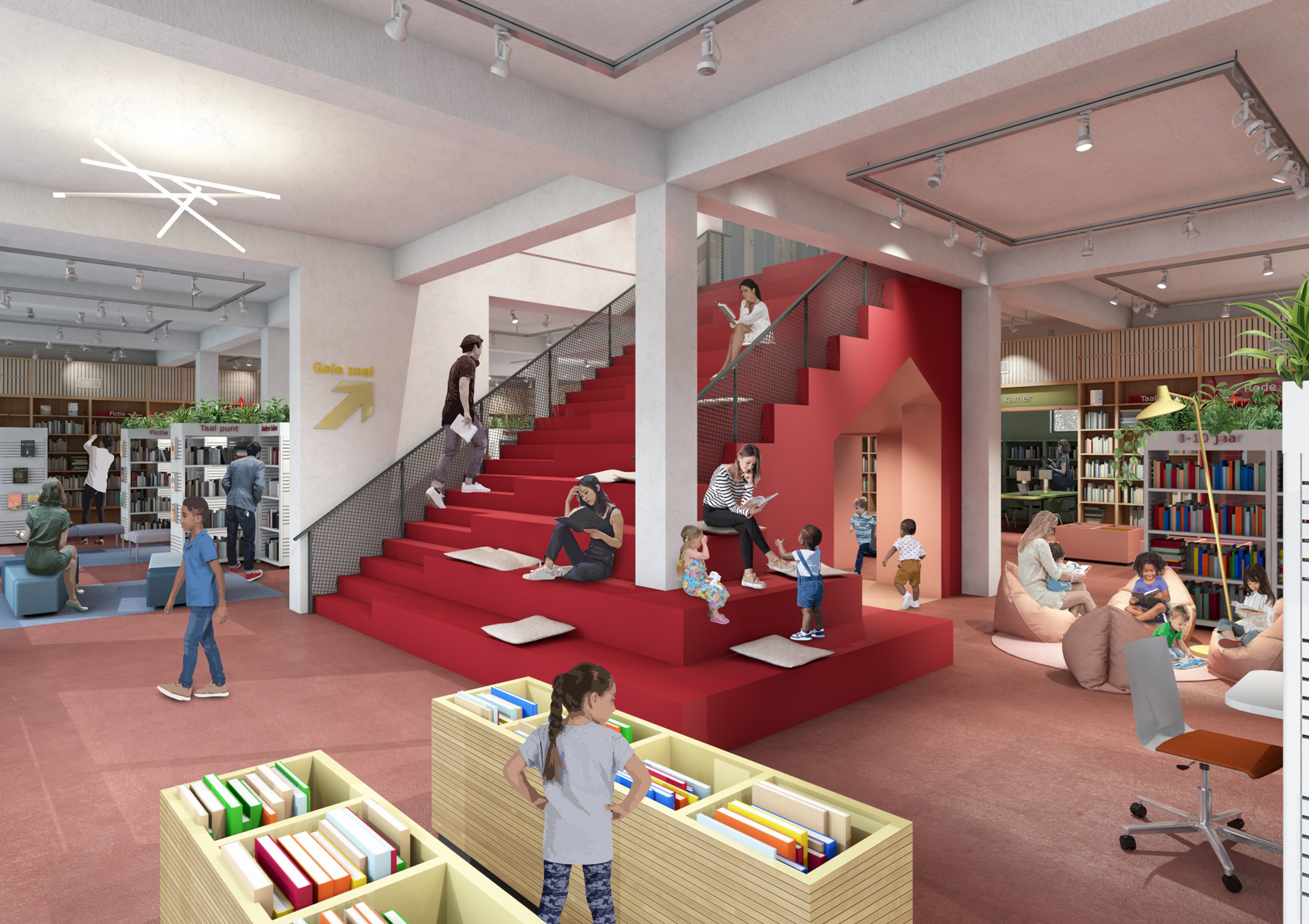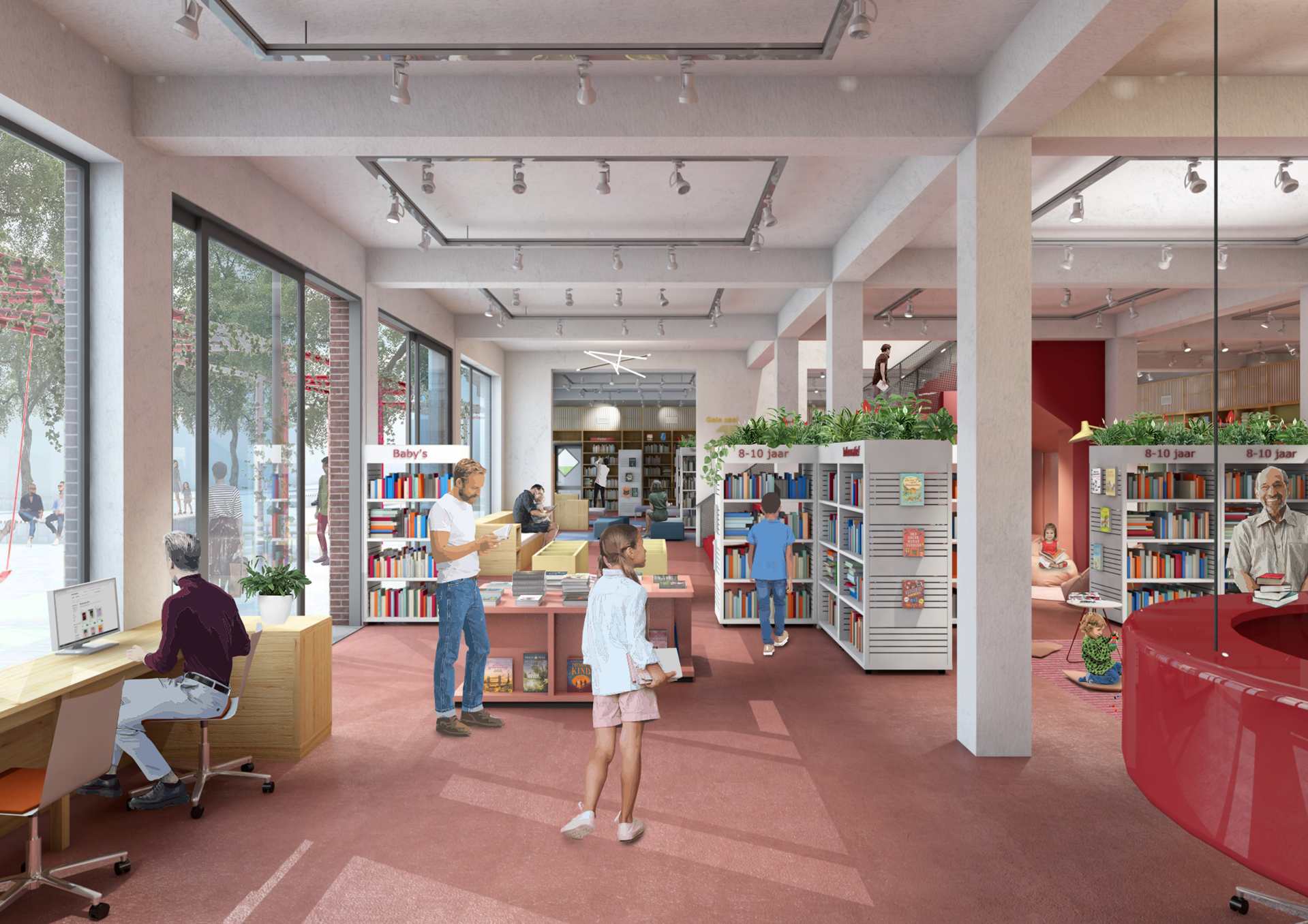 Voor de transformatie stelt WOONWERK architecten een aantal eenvoudige ingrepen voor die een impact hebben op het functionele, publieke en toegankelijk karakter dat nodig is voor de nieuwe functie. Naast het herinrichten en vergroenen van het voorplein wordt het gebouw voorzien van een uitnodigende entree en grote raampartijen die de relatie tussen binnen en buiten versterken. Centraal in het nieuwe interieur wordt een markante tribunetrap geplaatst. Dit wordt het herkenbare hart, een plek voor ontmoeting. Deze trap zorgt ook voor een directe verbinding tussen de bibliotheek en de publieke voorzieningen op de eerste verdieping.