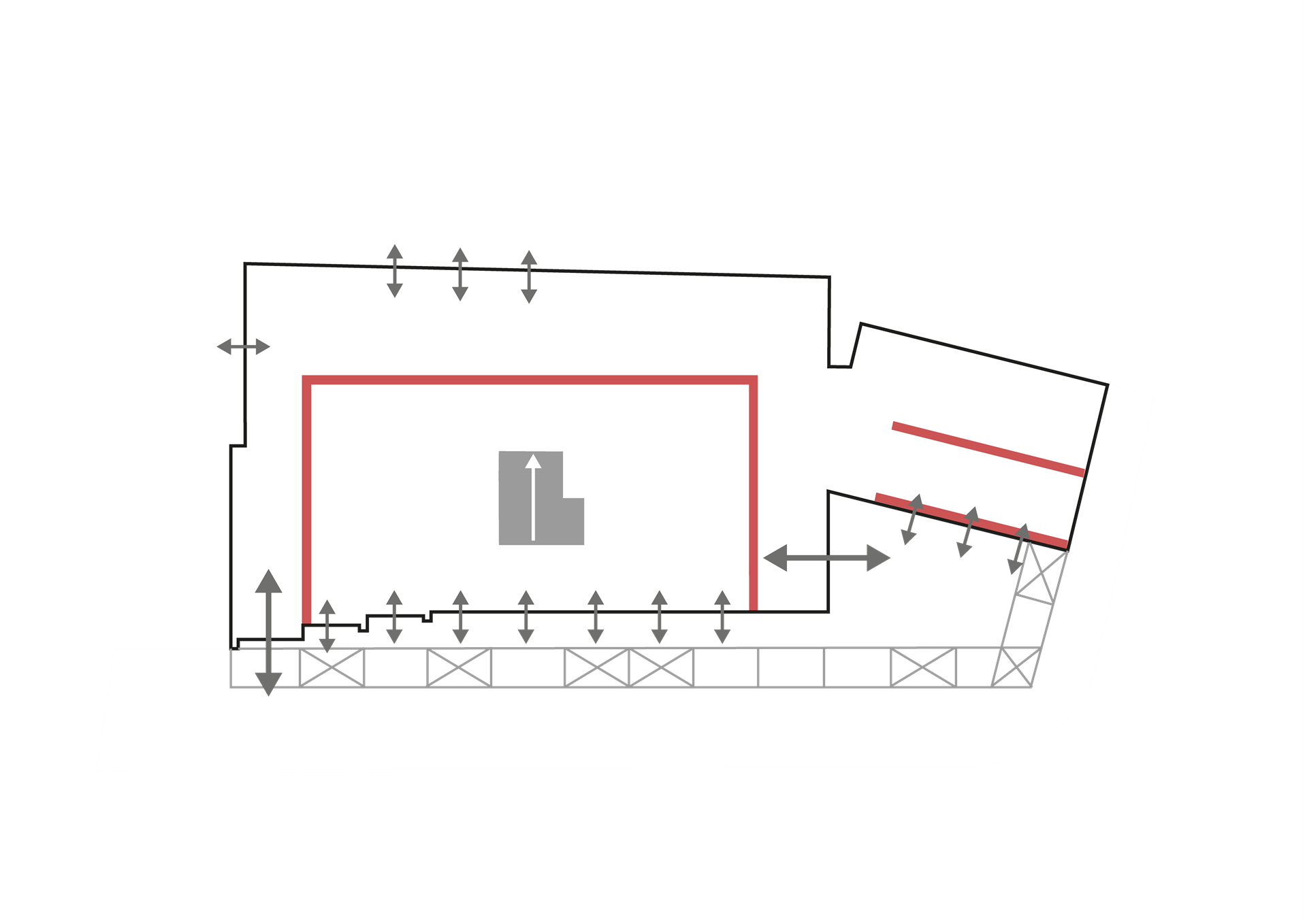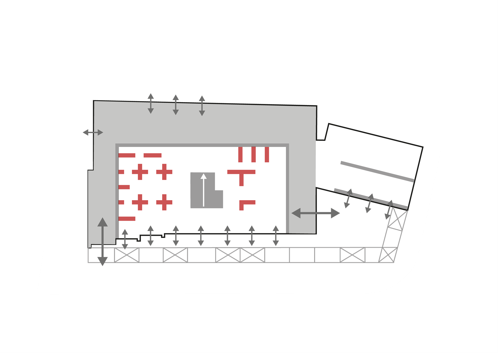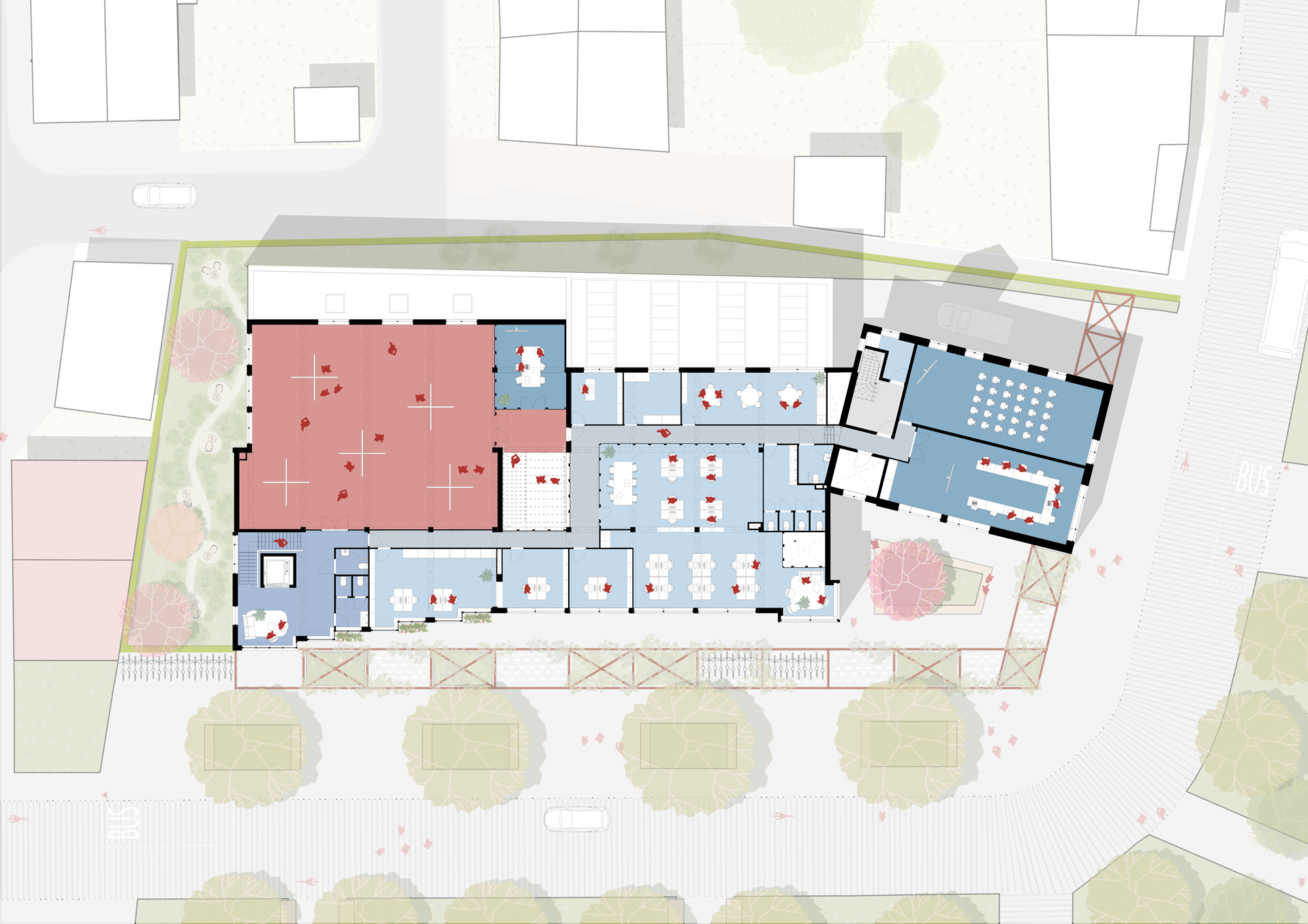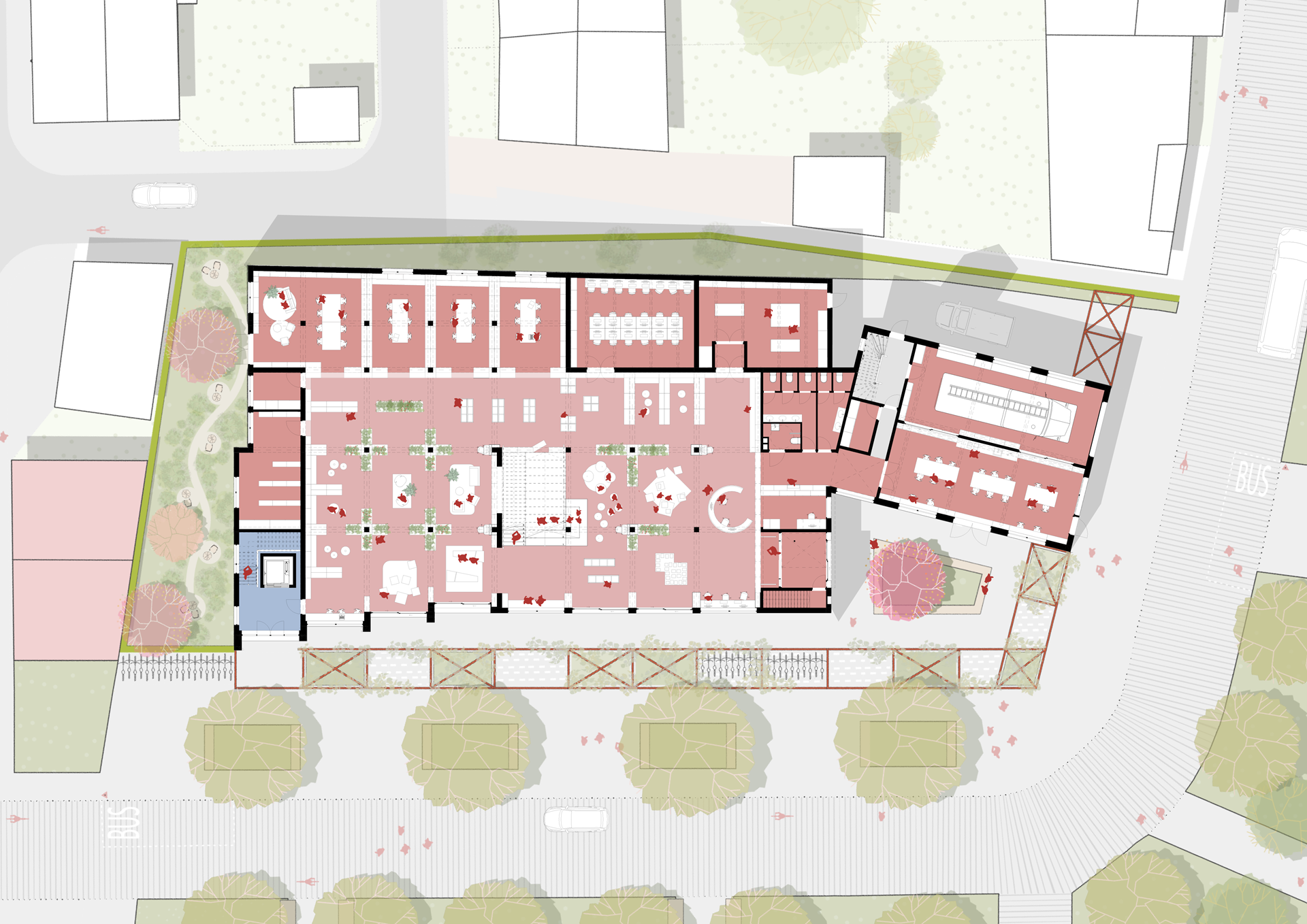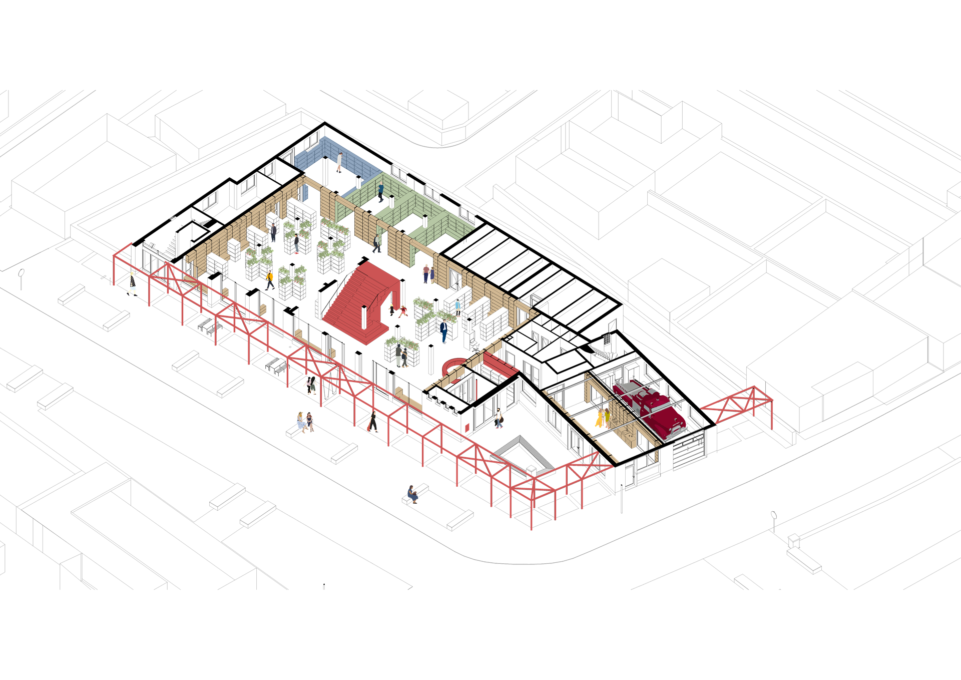 Voor de transformatie stelt WOONWERK architecten een aantal eenvoudige ingrepen voor die een impact hebben op het functionele, publieke en toegankelijk karakter dat nodig is voor de nieuwe functie. Naast het herinrichten en vergroenen van het voorplein wordt het gebouw voorzien van een uitnodigende entree en grote raampartijen die de relatie tussen binnen en buiten versterken. Centraal in het nieuwe interieur wordt een markante tribunetrap geplaatst. Dit wordt het herkenbare hart, een plek voor ontmoeting. Deze trap zorgt ook voor een directe verbinding tussen de bibliotheek en de publieke voorzieningen op de eerste verdieping.