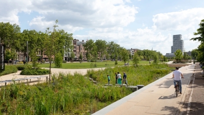 Een belangrijke troef van het Zuidpark is het vooruitstrevende waterbeheer. Regenwater van omliggende daken wordt opgevangen in een ondergronds reservoir en hergebruikt, terwijl regentuinen en een argexbuffer onder de centrale weide zorgen voor infiltratie en buffering. Dankzij de gelaagde beplanting met meer dan 500 bomen, 13.500 m² gras en duizenden struiken, draagt het park sterk bij aan biodiversiteit. Het resultaat is een levendig park voor jong en oud, dat spontaan gebruik aanmoedigt en veiligheid en sociale cohesie bevordert. Ook het intense participatietraject, begeleid door ontwerpintendant Aglaée Degros, maakte indruk op de jury.